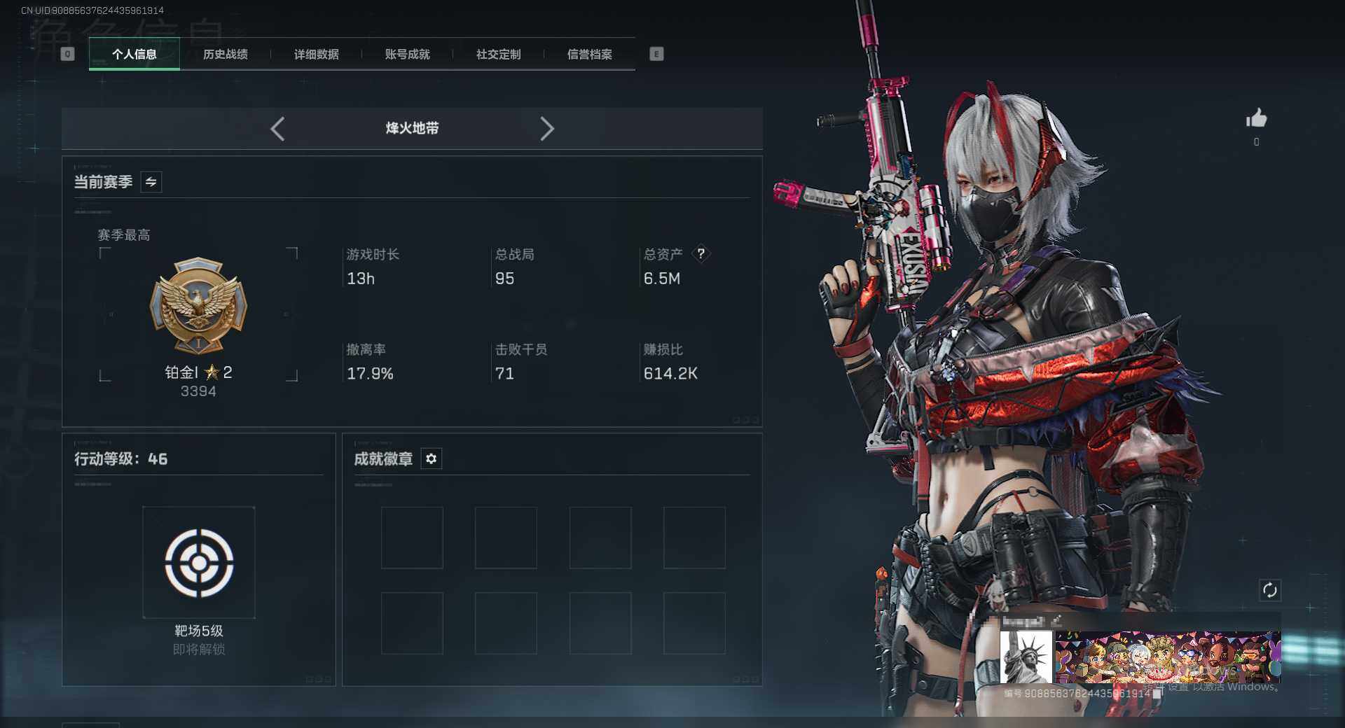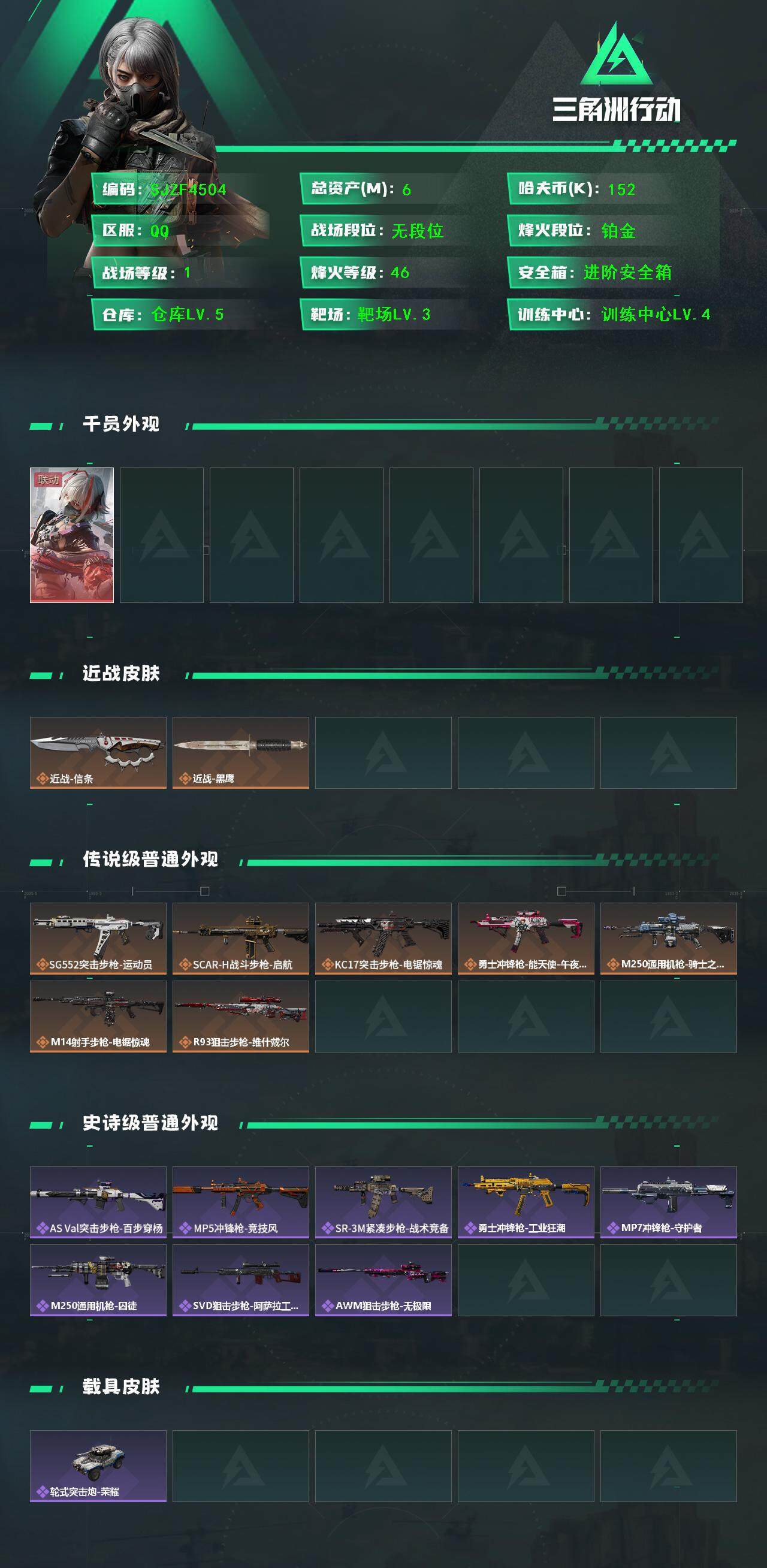 【SJZF4504】总资产(M):6M/哈夫币(K):152K/哈夫币(K):152K/全面战场等级:1_段位:无段位/烽火地带等级:46_段位:铂金/骇爪-维什戴尔/近战-信条/近战-黑鹰/SG552突击步枪-运动员/SCAR-H战斗步枪-启航/KC17突击步枪-电锯惊魂/勇士冲锋枪-能天使-午夜邮差/M250通用机枪-骑士之心/M14射手步枪-电锯惊魂/R93狙击步枪-维什戴尔/AS Val突击步枪-百步穿杨/MP5冲锋枪-竞技风/SR-3M紧凑突击步枪-战术竞备/勇士冲锋枪-工业狂潮/MP