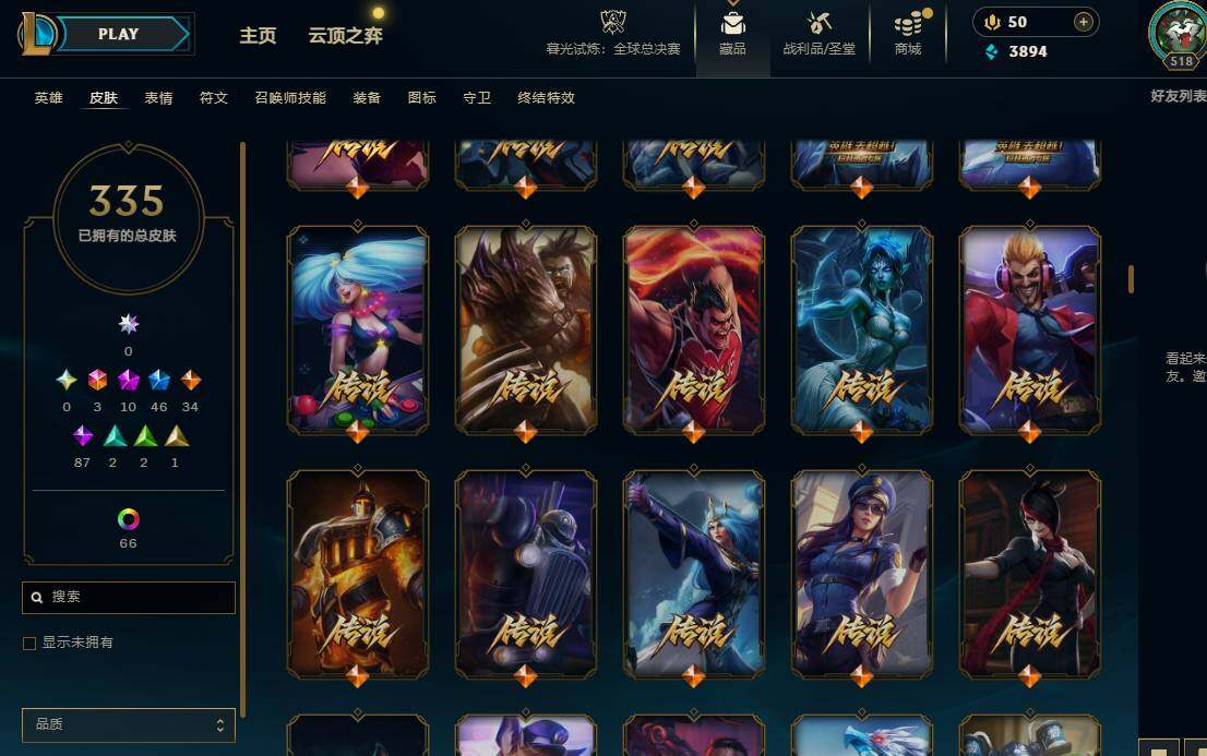 164英雄/335皮肤/3终极/10神话/46限定/1臻彩