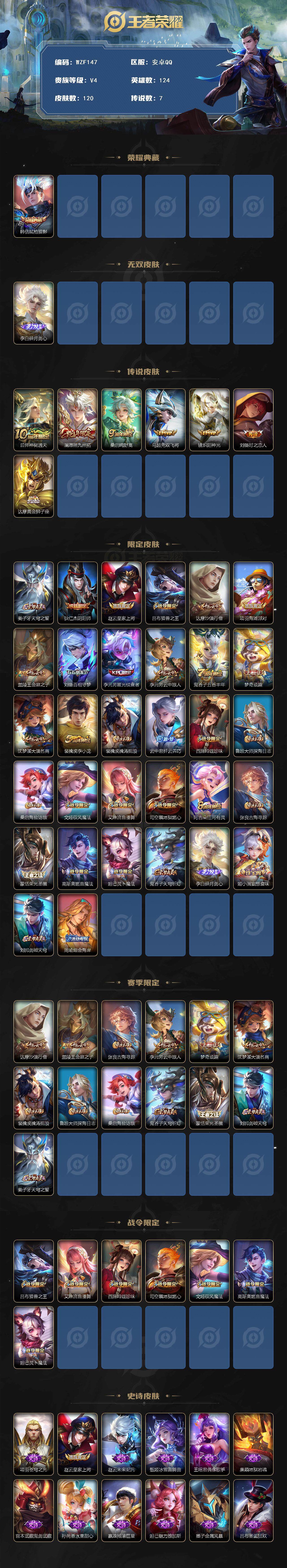 安卓QQ-1典藏-7传说-1无双-120皮肤-124英雄-永恒钻石-