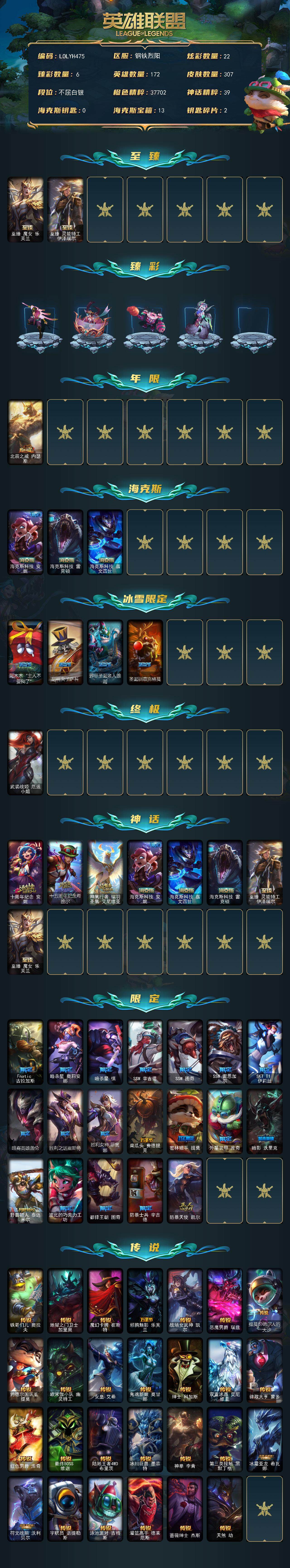 【LOLYH475】172英雄/307皮肤/1终极/8神话/24限定/6臻彩/22炫彩/27传说/78史诗/白银账号等级:303/至臻魔女乐芙兰/至臻灵能特工伊泽瑞尔/玉剑传说无影竞星/玉剑传说琴仙子丁香/可爱可爱粉红红布里茨/魔女阿卡丽虚荣/魔女阿狸饕餮/净雪之月莫甘娜冬虹/北辰之威内瑟斯/海克斯科技安妮/海克斯科技雷克顿/海克斯科技嘉文四世/阿木木“主人不要我了”/胡桃夹子萨科/邪恶圣诞老人维迦/圣诞驯鹿克格莫/武装战姬厄运小姐/十周年纪念安妮/十五周年纪念希维尔/神凰行者瑞羽圣凰艾尼维亚/
