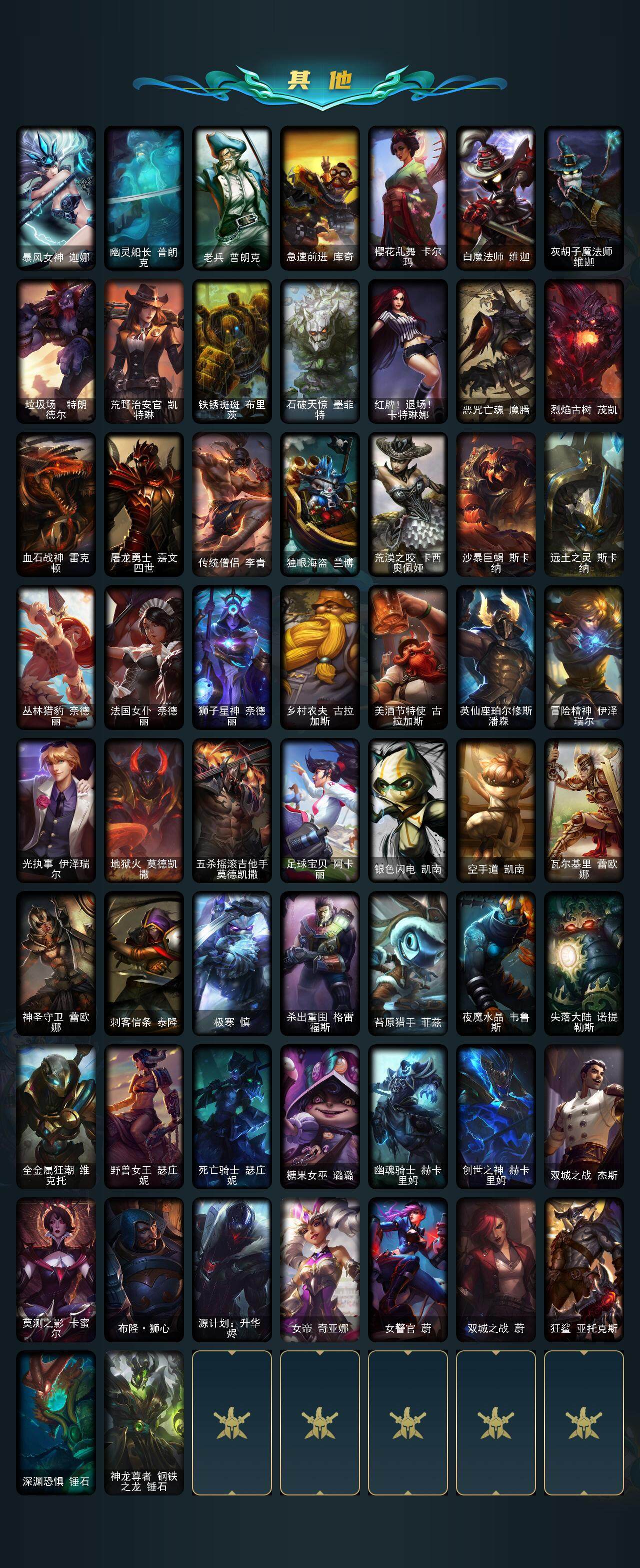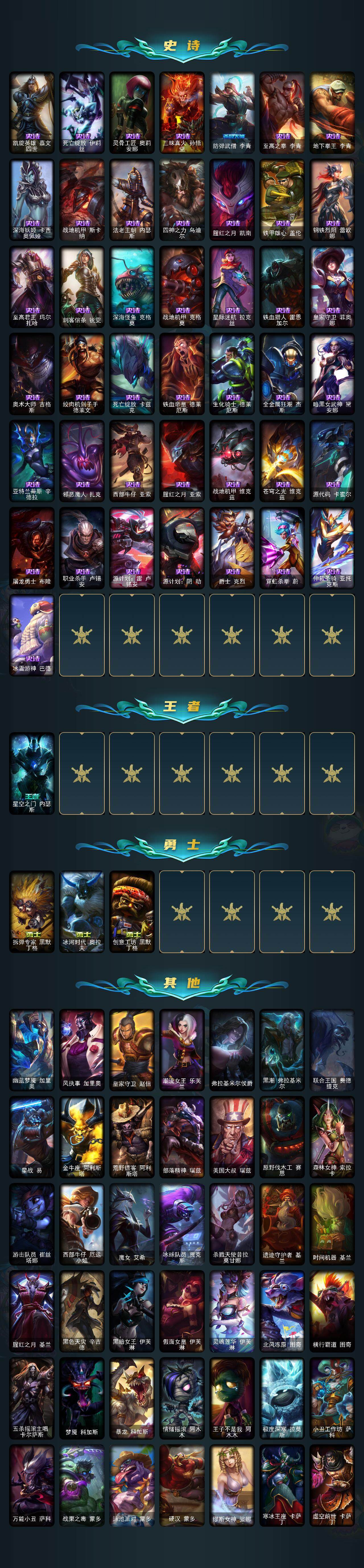 172英雄/221皮肤/2神话/36限定/1臻彩/3炫彩