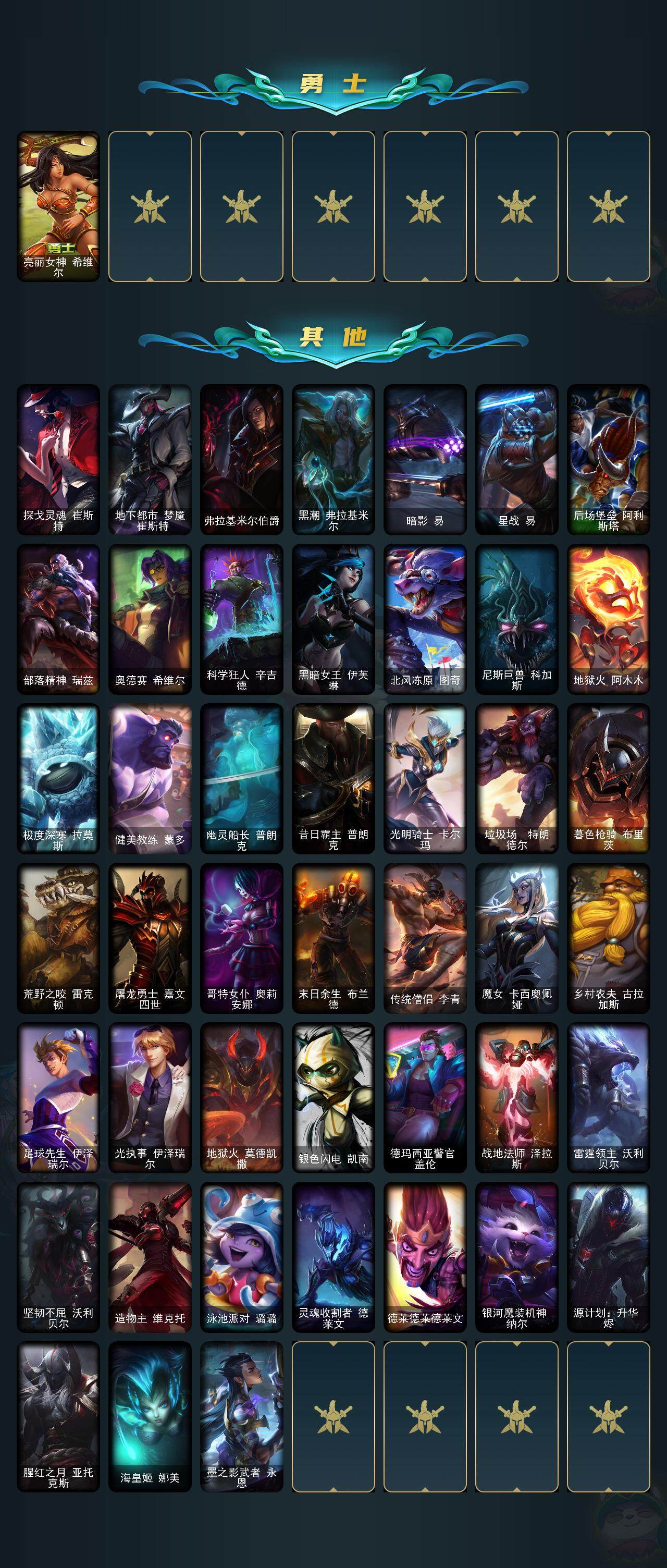 171英雄/111皮肤/2神话/15限定/3臻彩/8炫彩/12传说