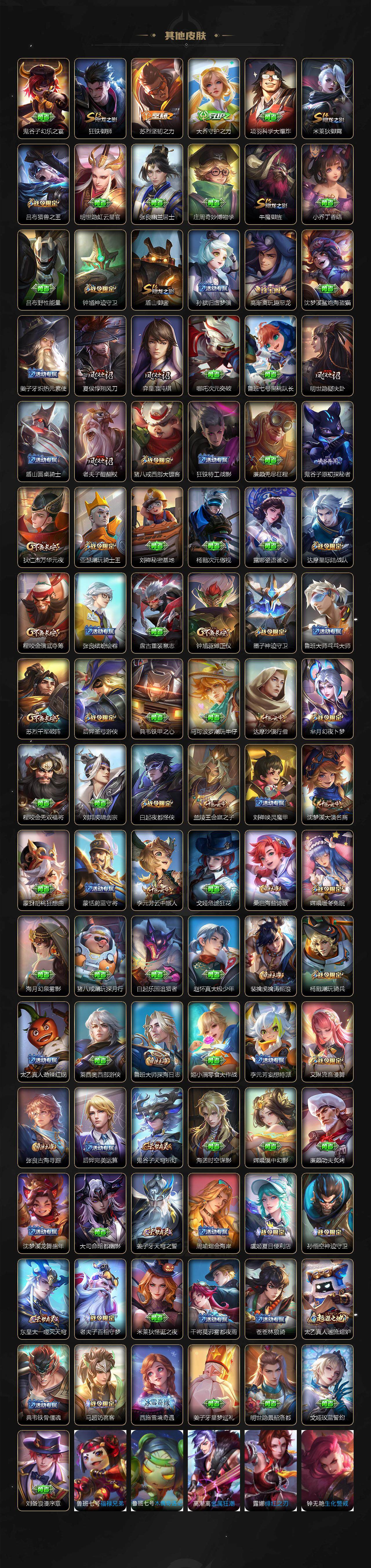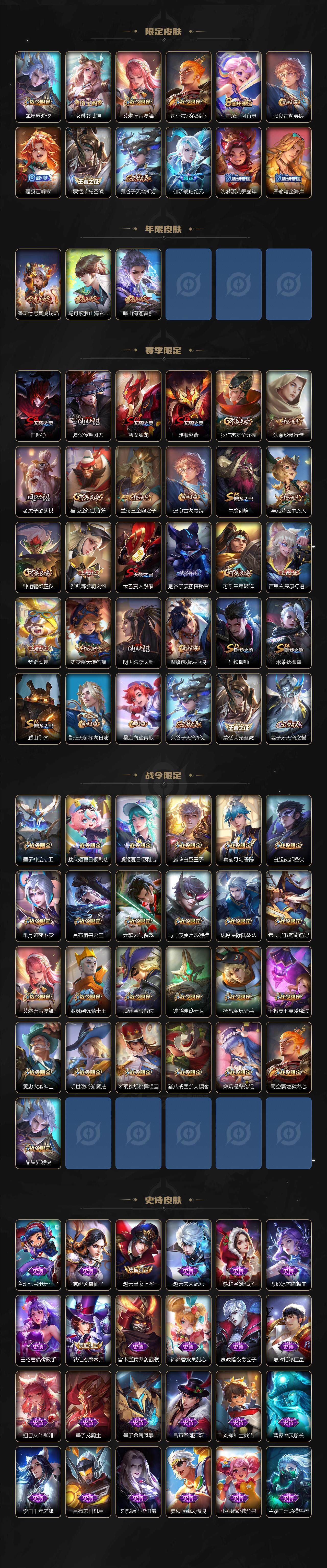 【传说皮肤】:孙尚香末日机甲,虞姬启明星使,鲁班七号寅虎瑞焰,马超无双飞将,李白诗剑行,曜山海苍雷引,花木兰燃星之曲,诸