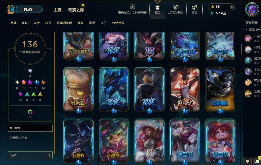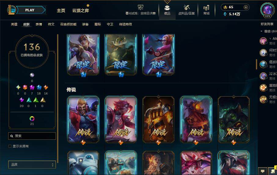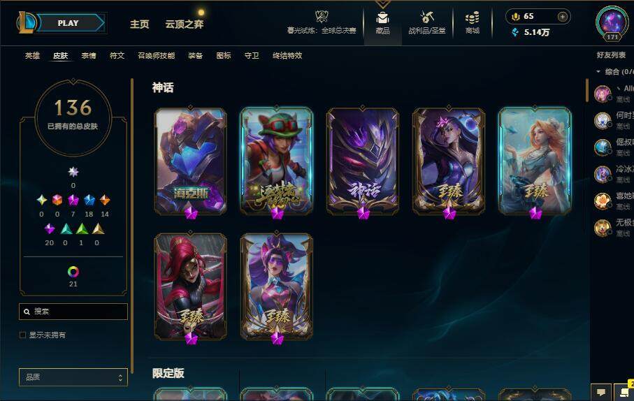 172英雄/136皮肤/7神话/18限定/8臻彩/63炫彩