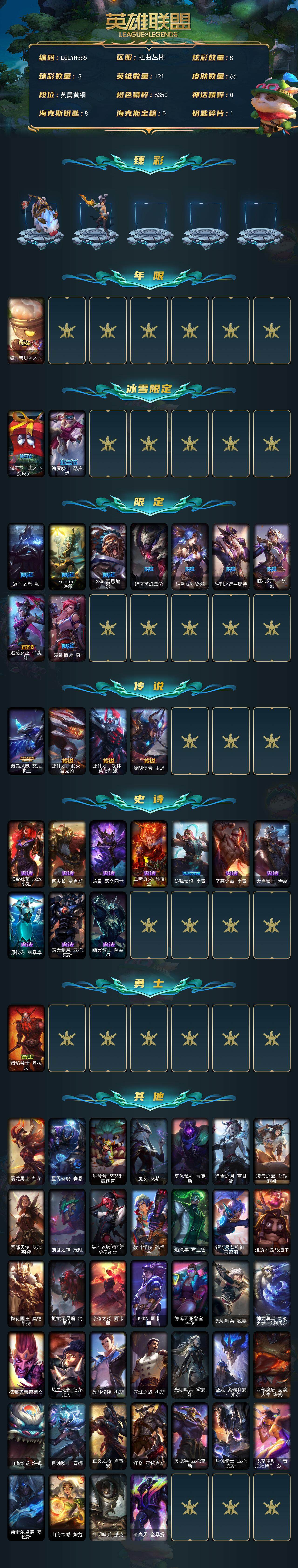 【LOLYH565】121英雄/66皮肤/12限定/3臻彩/8炫彩/4传说/10史诗/青铜/无畏骑士瑟庄妮赤子初心/雾雨之刃锐雯/幽梦玫瑰伊莉丝浪漫花蕾/点心宝贝阿木木/阿木木“主人不要我了”/魄罗骑士瑟庄妮/冠军之隐劫/Fnatic迦娜/SSW雷恩加尔/暗裔英雄盖伦/胜利女神娑娜/胜利之运崔斯特/胜利女神菲奥娜/魅惑女巫菲奥娜/意乱情迷蔚/黯晶凤凰艾尼维亚/源计划泯灭雷克顿/源计划超体莫德凯撒/黎明使者永恩/黑帮狂花厄运小姐/百夫长贾克斯/暗星嘉文四世/三昧真火孙悟空/防弹武僧李青/至高之拳李