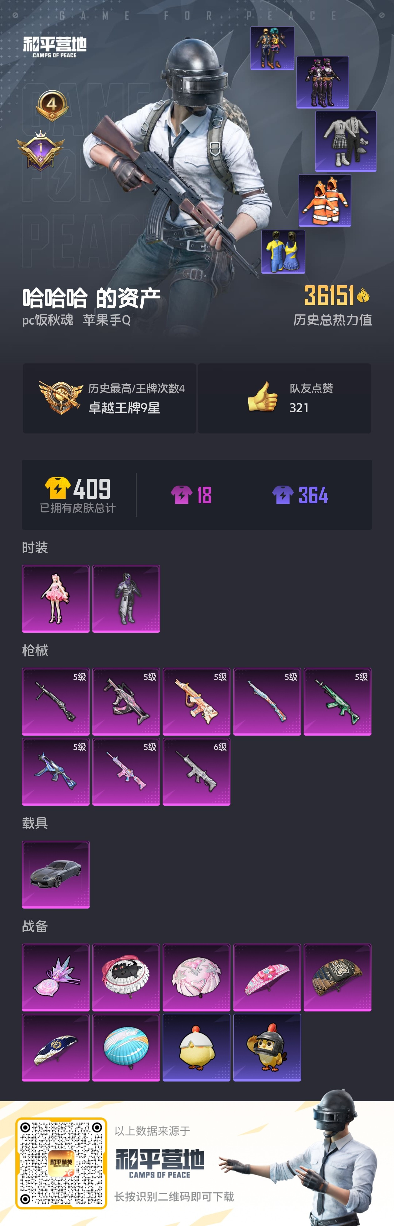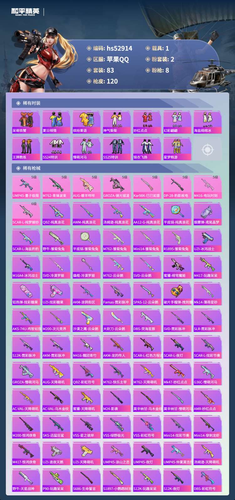 hs52914 苹果手Q-4王牌印记-2粉装-8特效枪-1载具-36151热力值-83套装-120枪