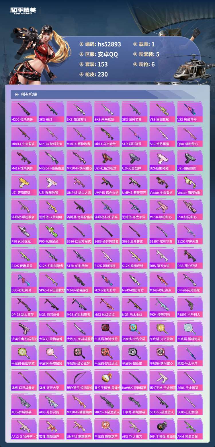 hs52893 安卓手Q-15王牌印记-5粉装-6特效枪-1载具-68326热力值-153套装-23