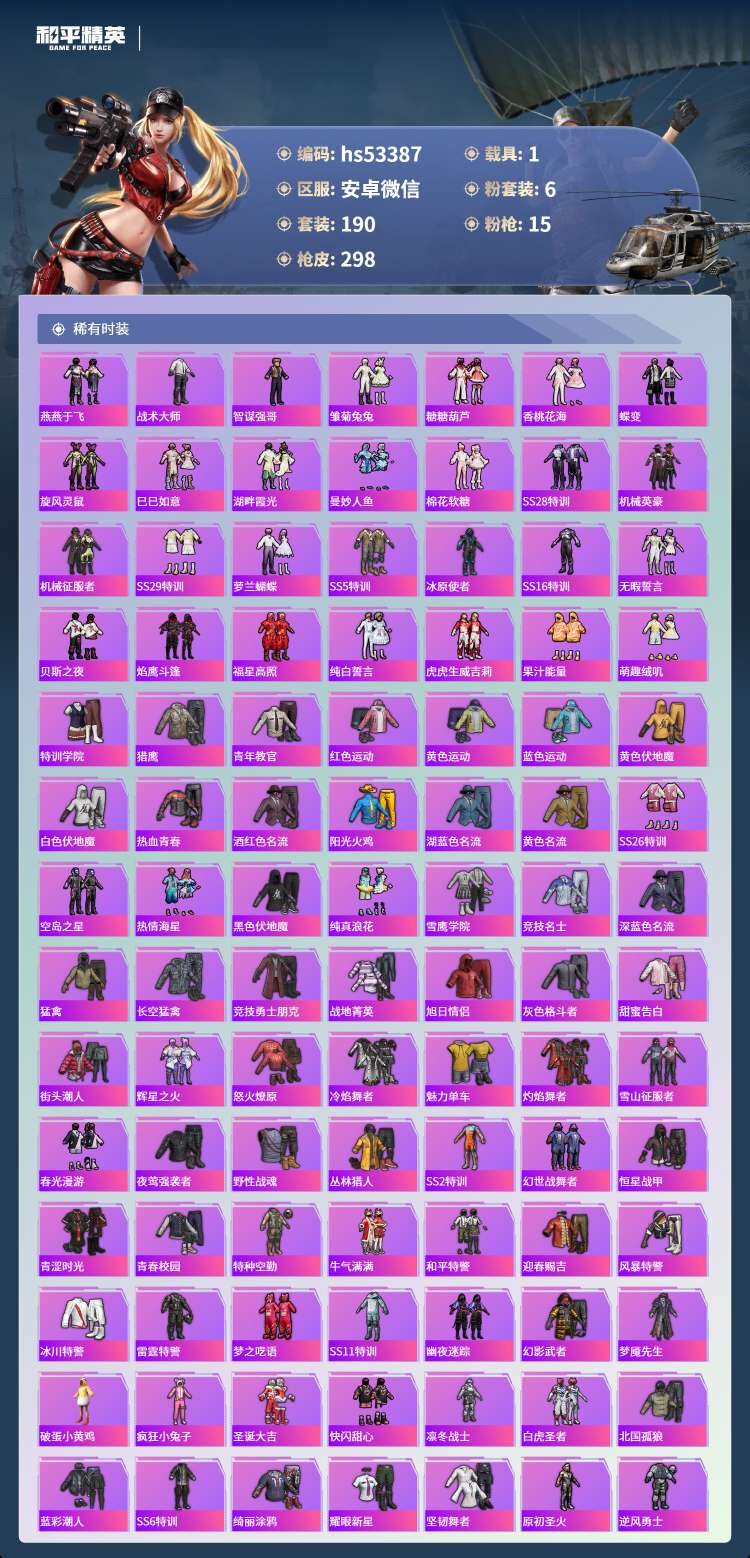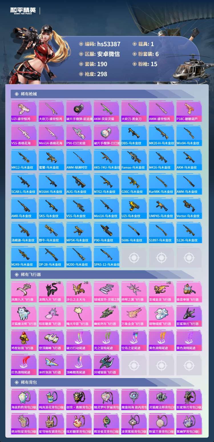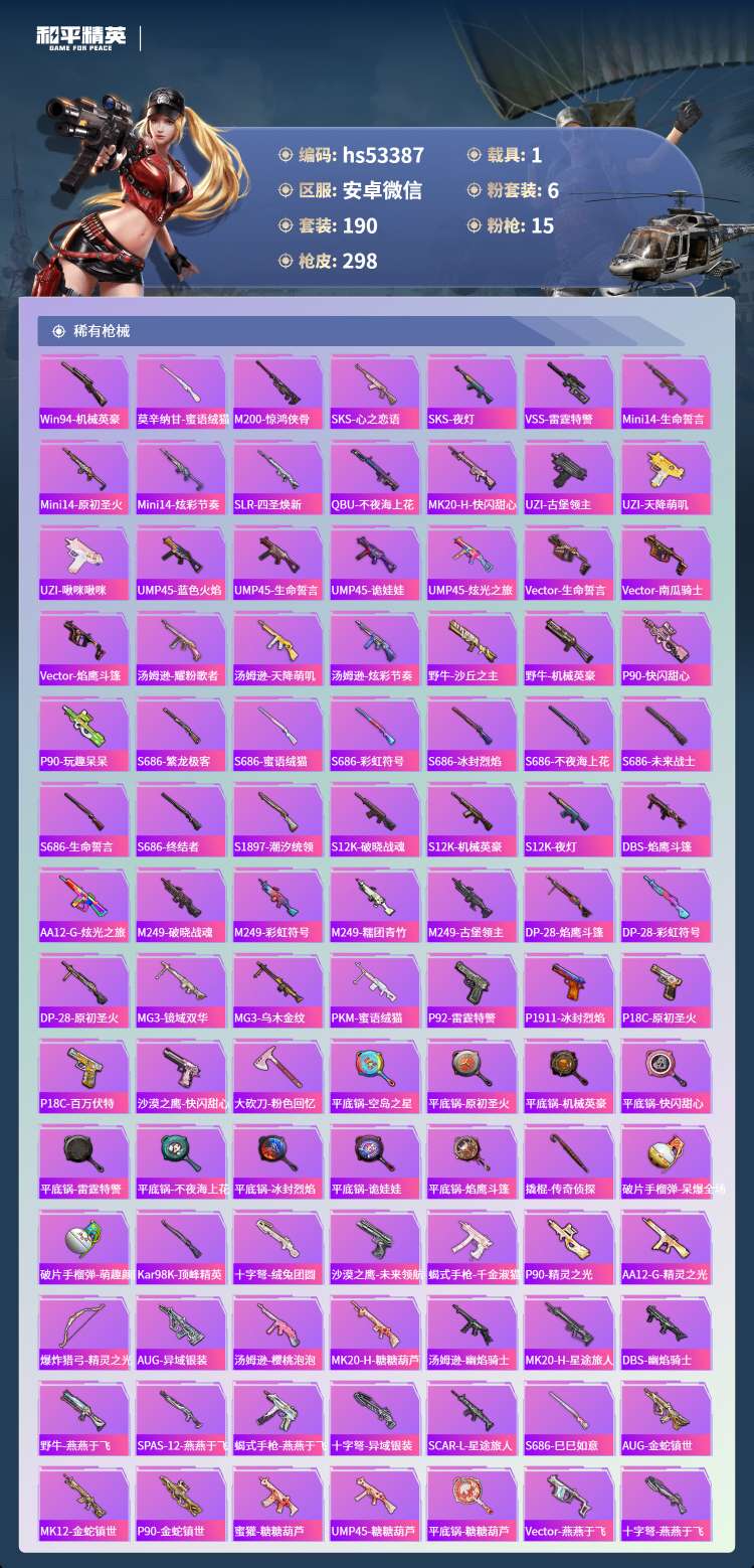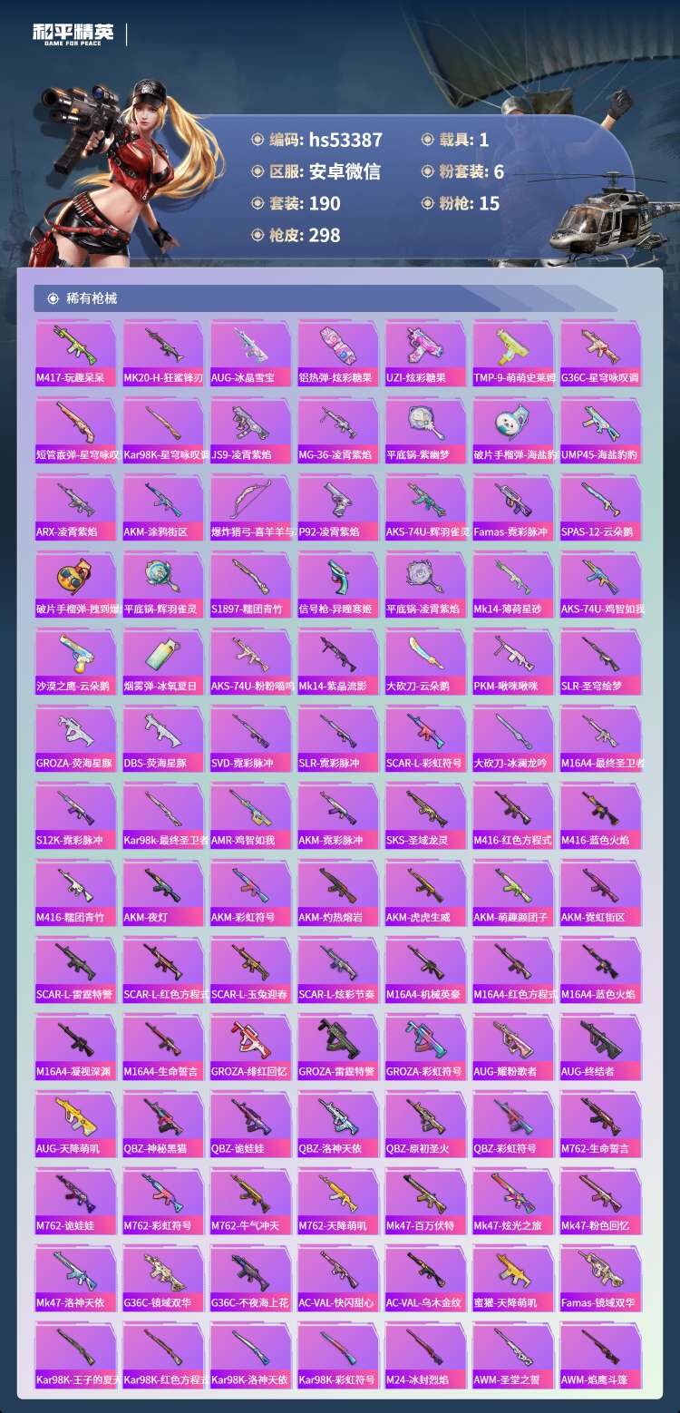 hs53387 安卓微-10王牌印记-1红装-6粉装-15特效枪-1载具-96501热力值-190
