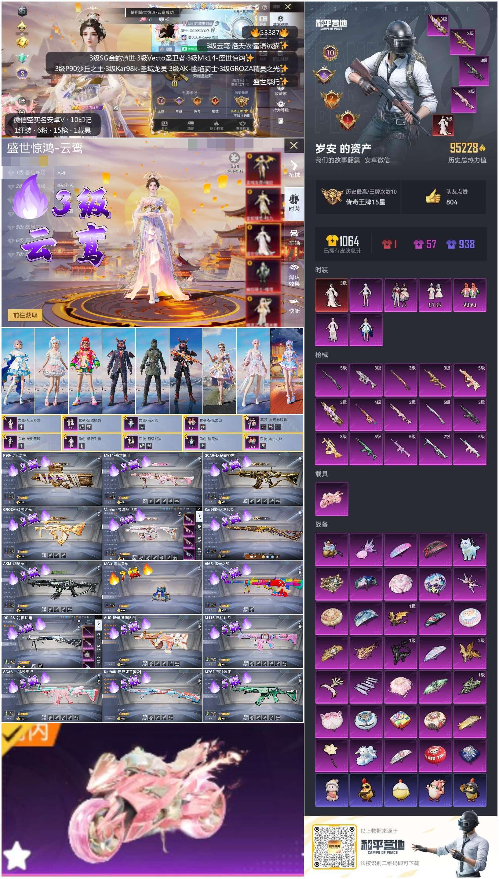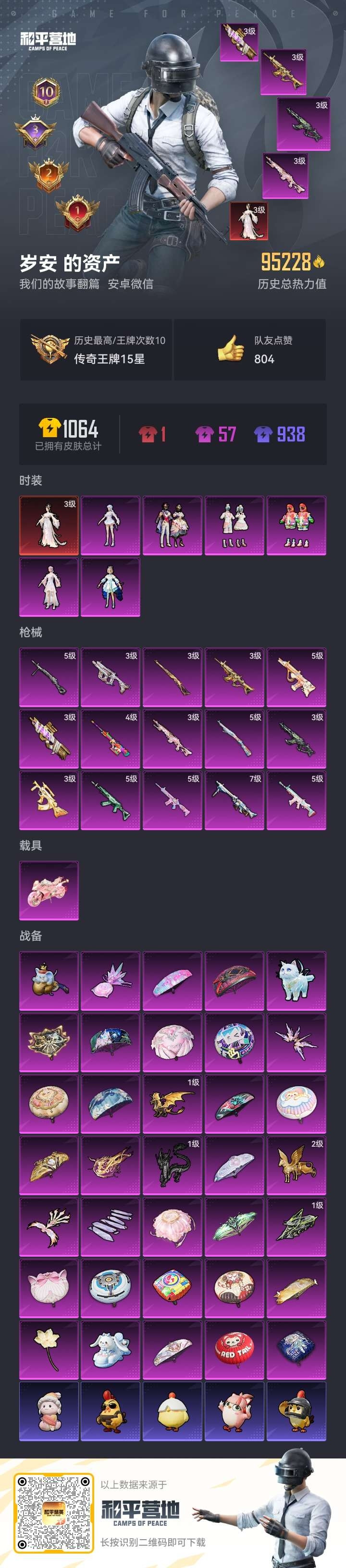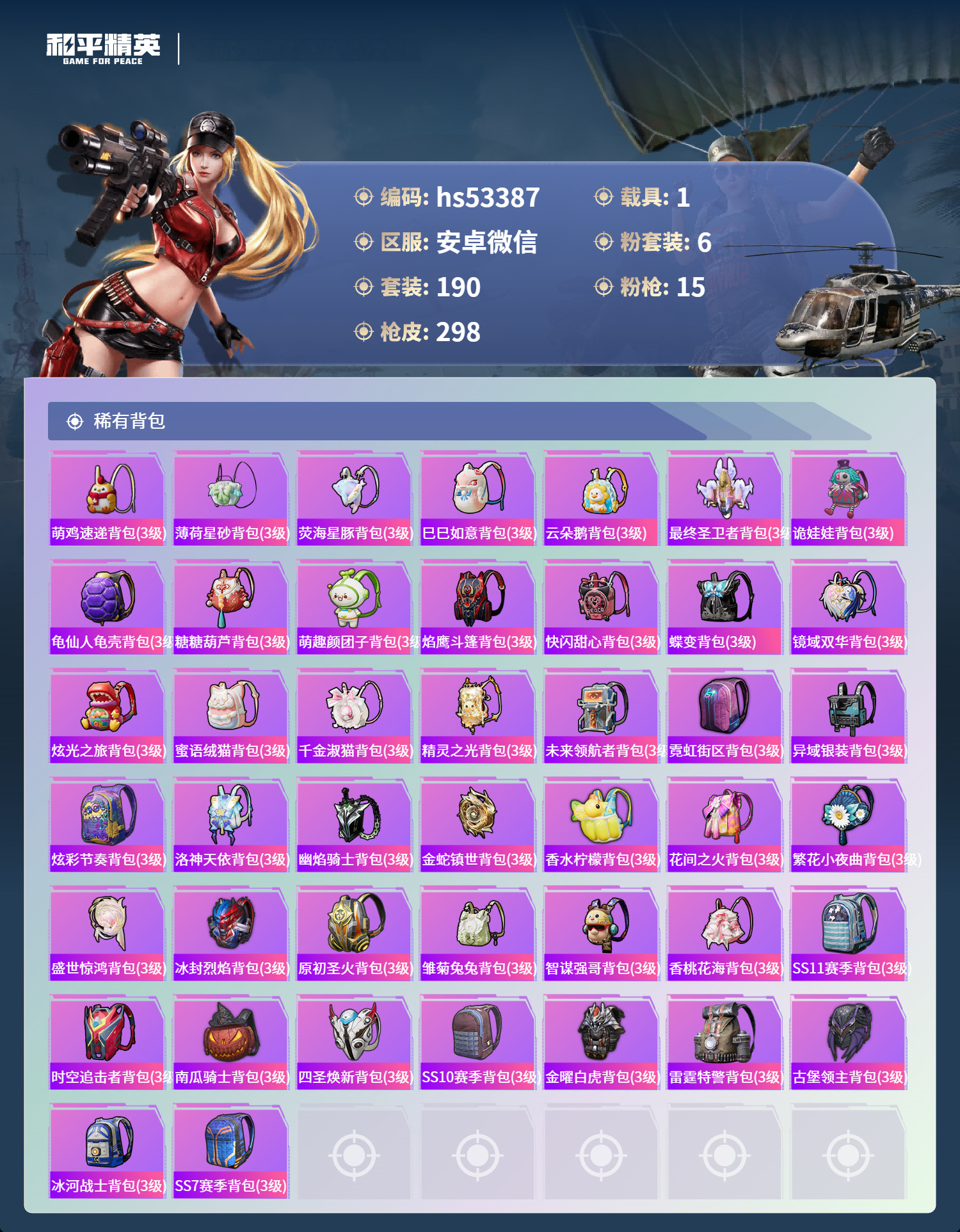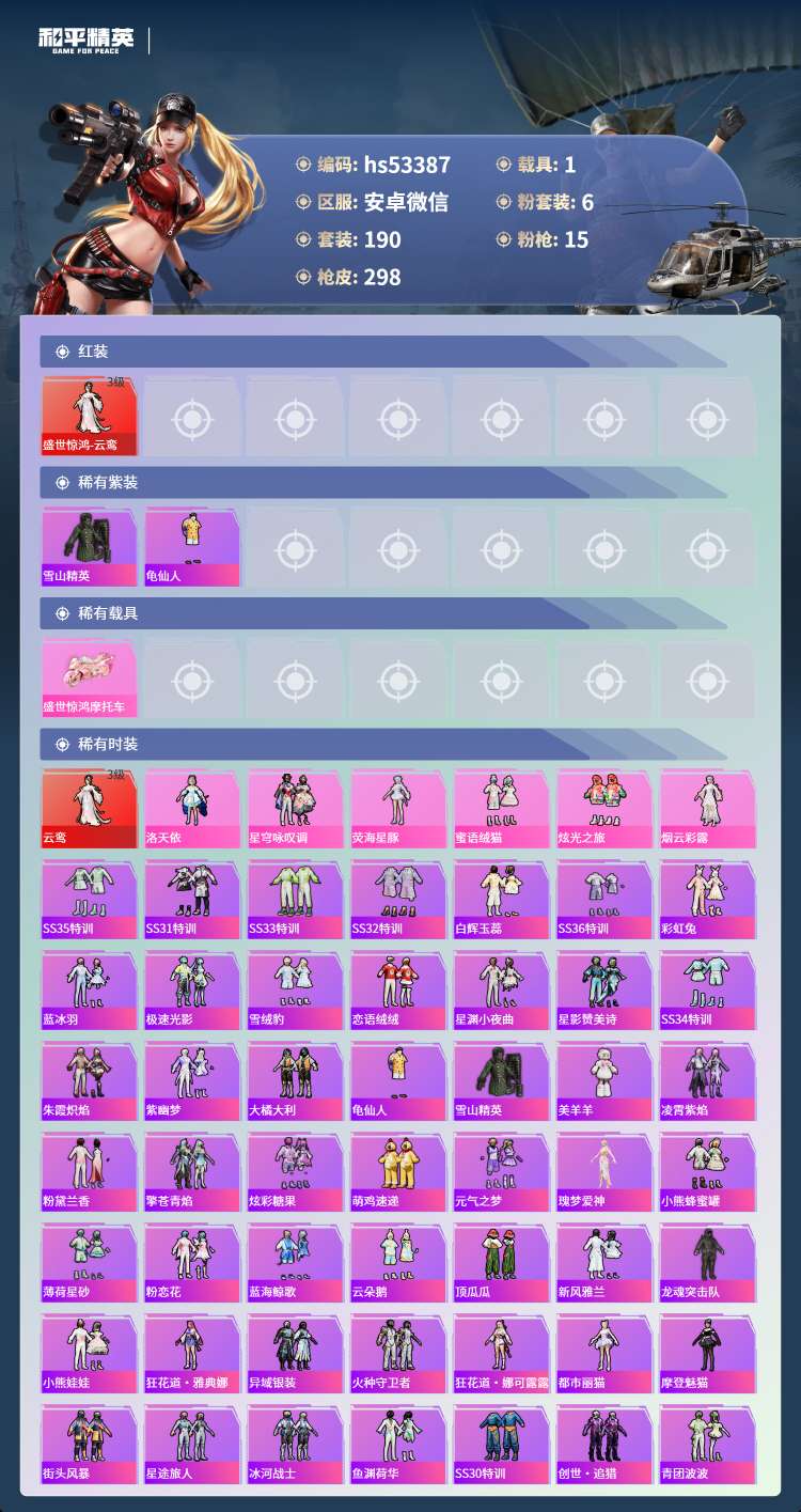 hs53387 安卓微-10王牌印记-1红装-6粉装-15特效枪-1载具-96501热力值-190