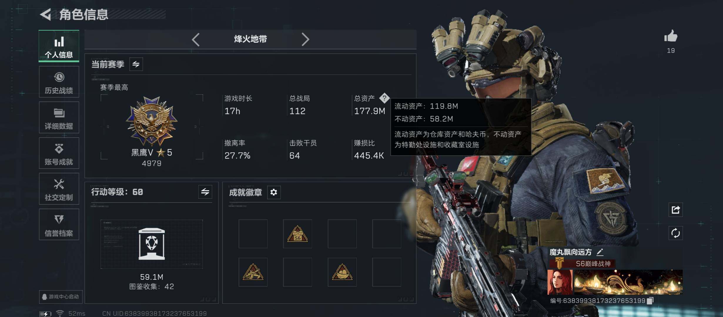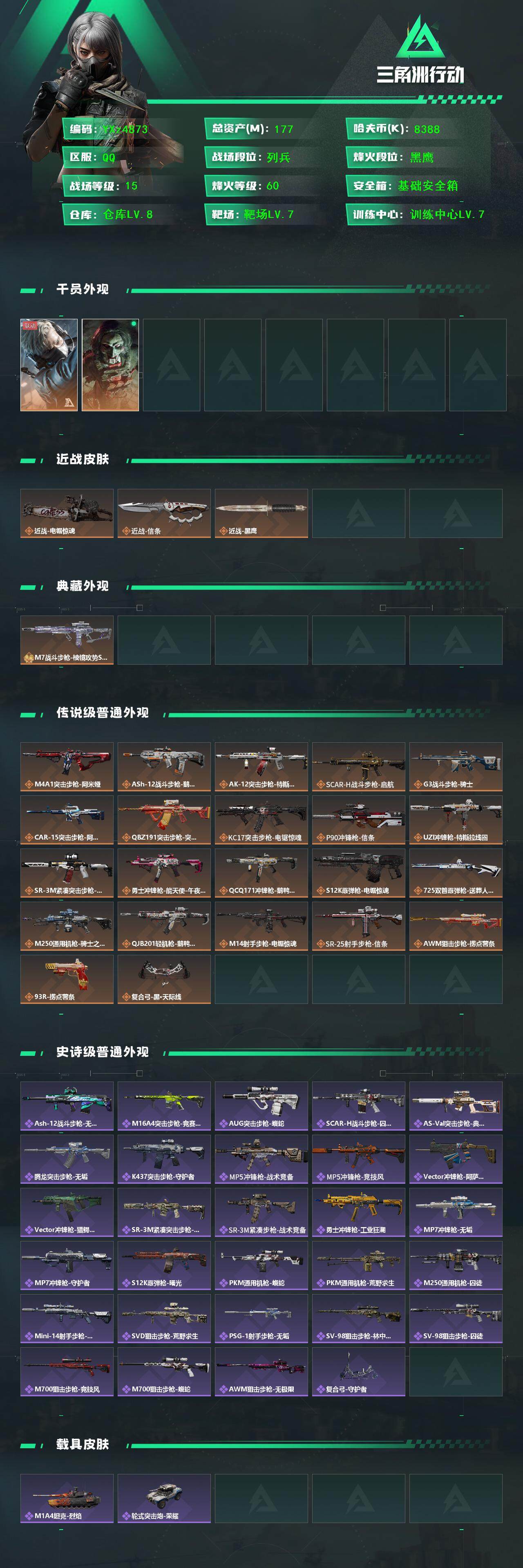 【Q区三端互通】【【无二次协助处理】】YXz4873-特勤处:仓库8级/靶场7级/训练中心7级-总资产177.9m-哈夫币838w-烽火等级:60级