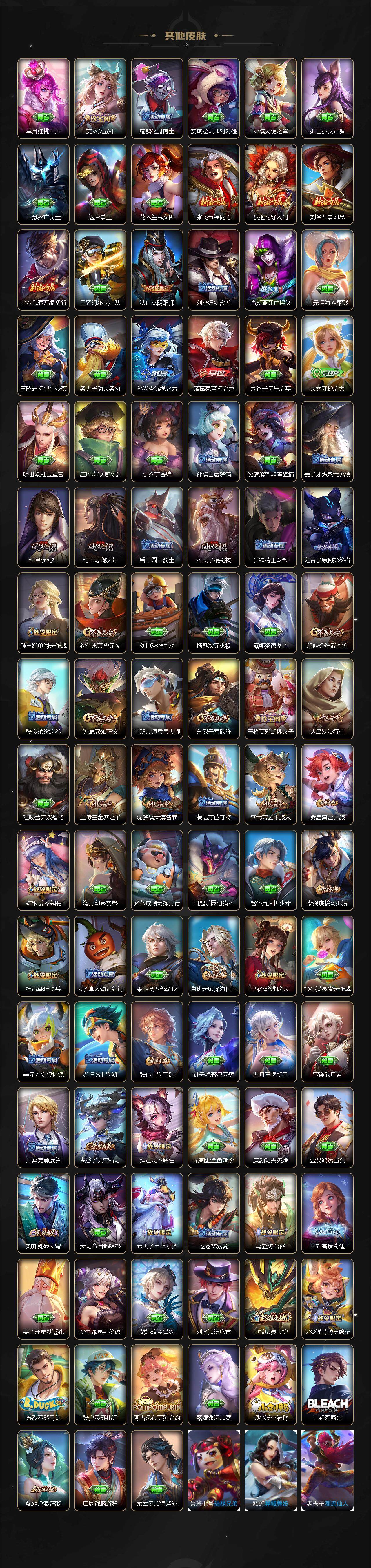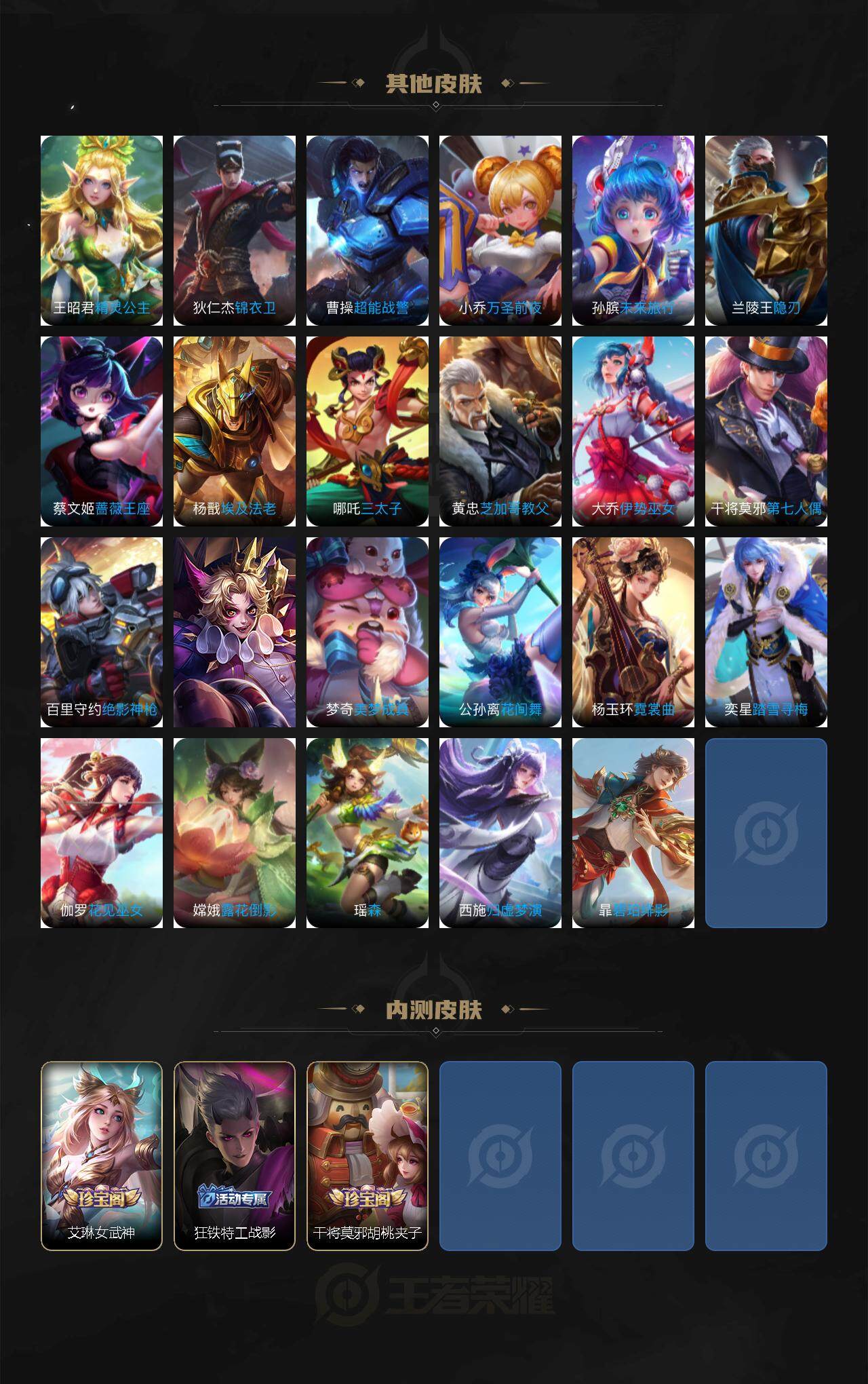 【传说皮肤】:桑启鸣野蒿,大乔时之奇旅,公孙离记忆之芯,小乔山海琳琅生,不知火舞绯月行,瑶时之祈愿,西施游龙清影,诸葛亮时雨天司,貂蝉猫影幻舞