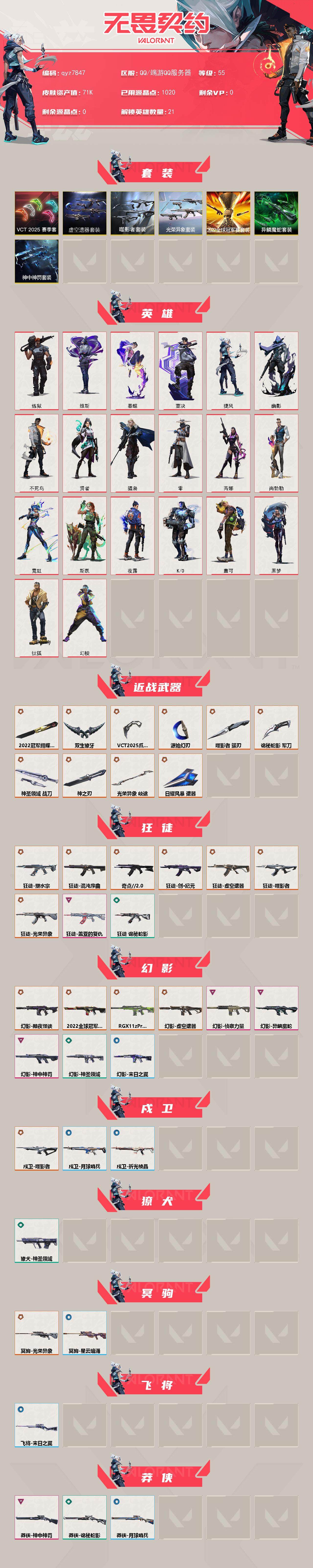 【qyz7847】22套装 25爪 异鳞魔蛇套装 qyz7847 亮点皮肤: 幻影-2022全球冠军赛,蝴蝶刀-2022全球冠军赛 套装: 异鳞魔蛇,VCT 2025赛季礼包,虚空遗器,噬影者,神中神罚套装,光荣异象,2022全球冠军赛 近战武器皮肤: 神圣领域 战刀,双生獠牙,VCT 2025 爪刀,源始幻刃,噬影者簇刃,诡秘蛇影,神之刃,歧途 步枪皮肤: 狂徒-盖亚的复仇,幻影-侦察力量,狂徒-塑水宗,狂徒-混沌序曲,幻影-黯夜怪谈,狂徒-奇点//2.0,狂徒-创·纪元,幻影-RGX 11z