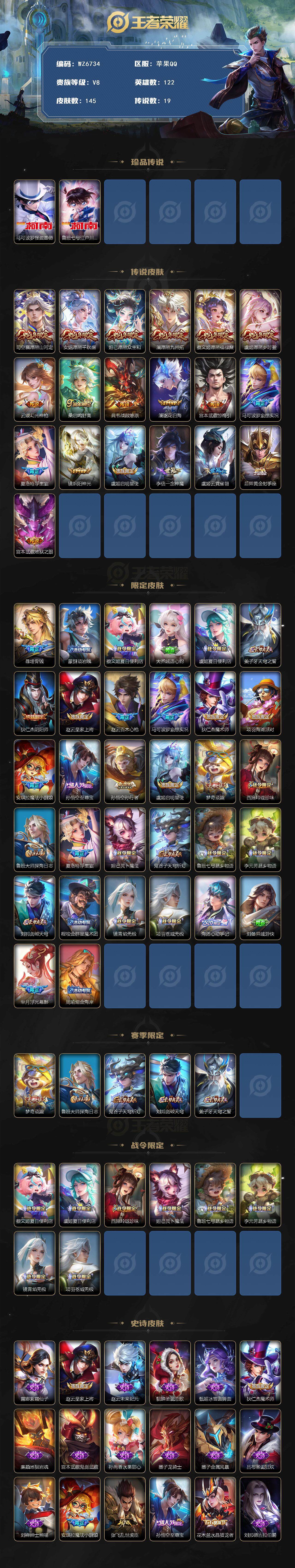 【满蛇年全套双侦探珍品】V8-永恒钻石III段位-122英雄-145皮肤-2珍品传说-19传说-52史诗