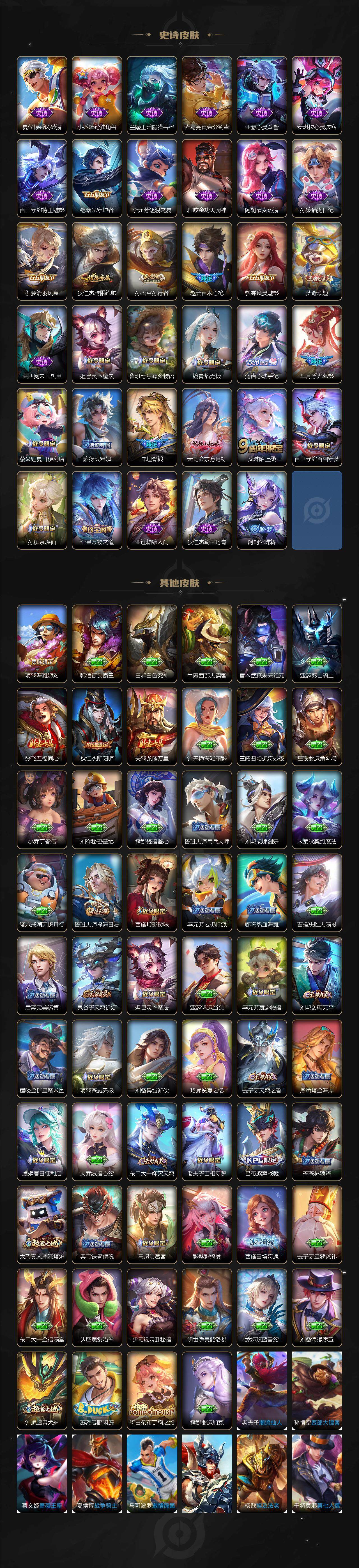 【传说皮肤】:司空震愿照山河定,女娲愿照千秋盛,妲己愿照众生和,澜愿照九州拓,蔡文姬愿照福禄聚,虞姬愿照岁时盈,云缨幻光神枪,桑启鸣野蒿,典韦战鼓燎原,澜逐花归海,宫本武藏惊梅引,马可波