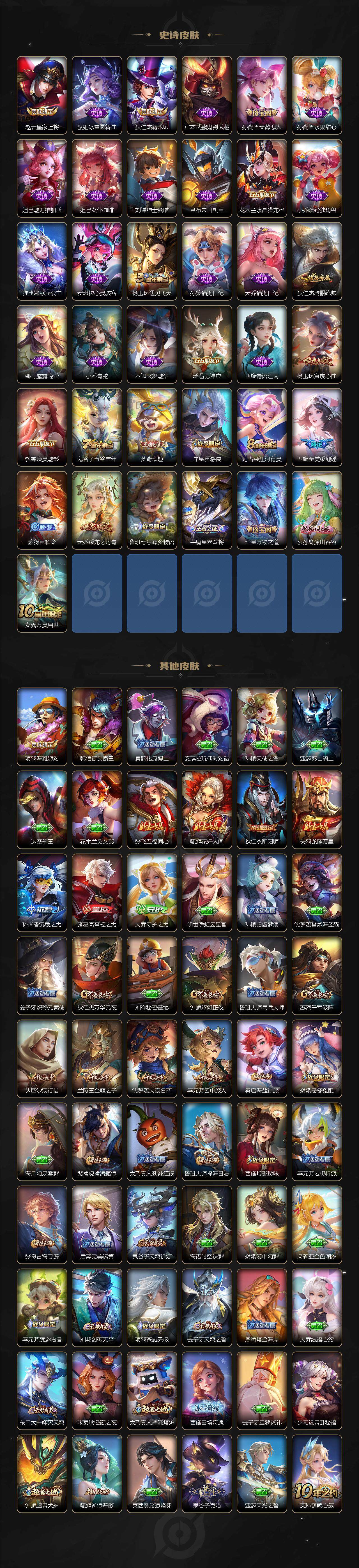 【传说皮肤】:后羿神树通天,杨玉环星之鸣奏,妲己愿照众生和,王昭君映山客,桑启鸣野蒿,大乔时之奇旅,不知火舞绯月行,西施游龙清影,小乔音你心动,公孙离祈雪灵祝,貂蝉仲夏夜之梦