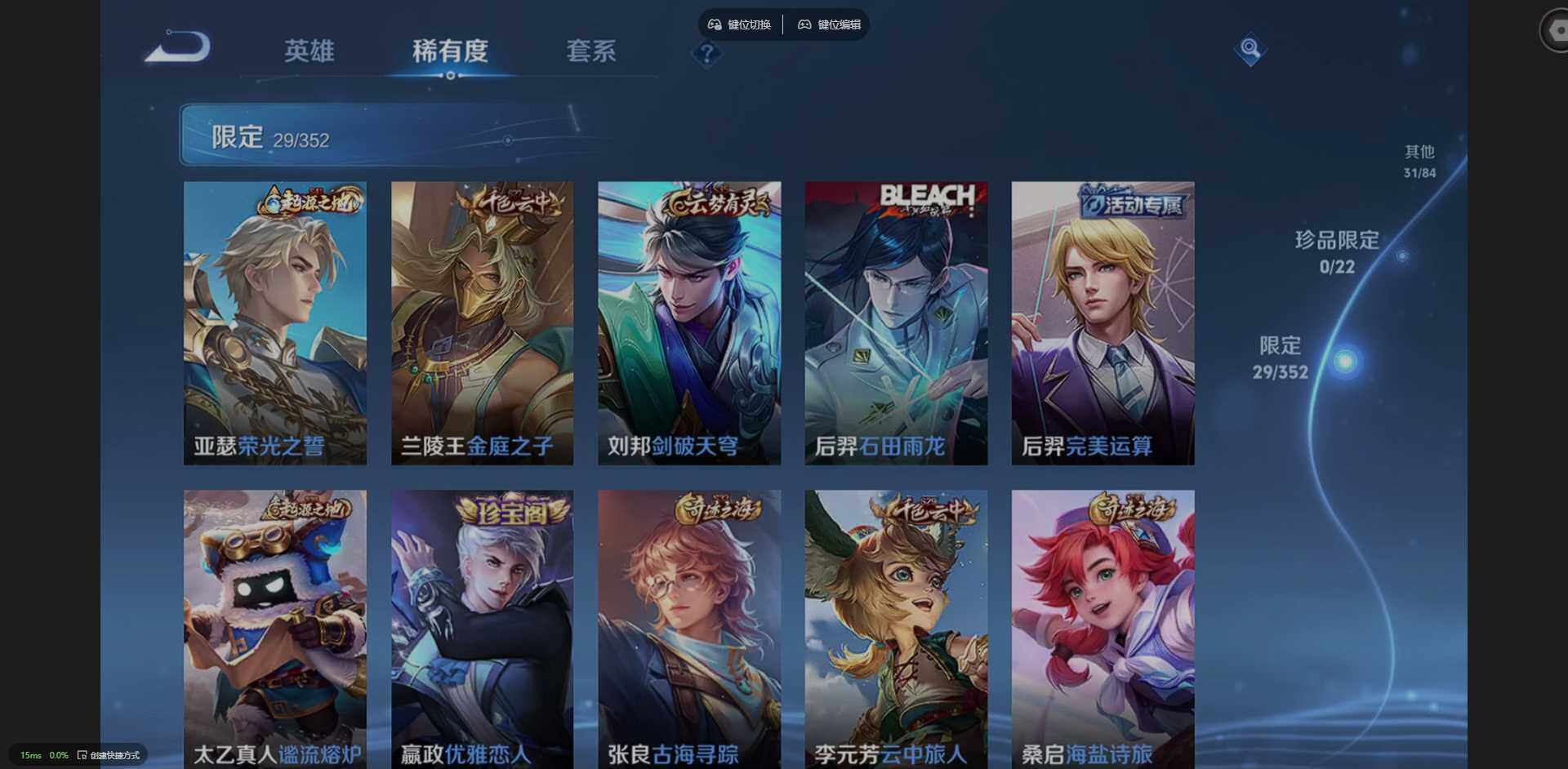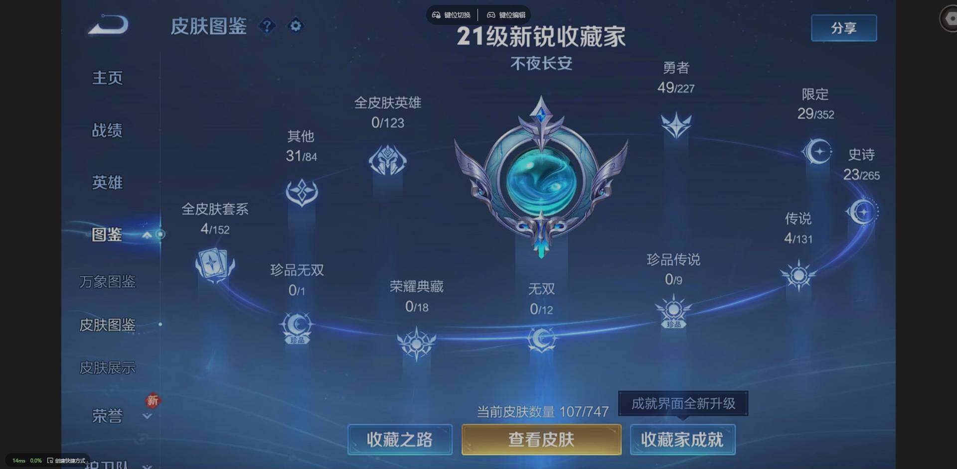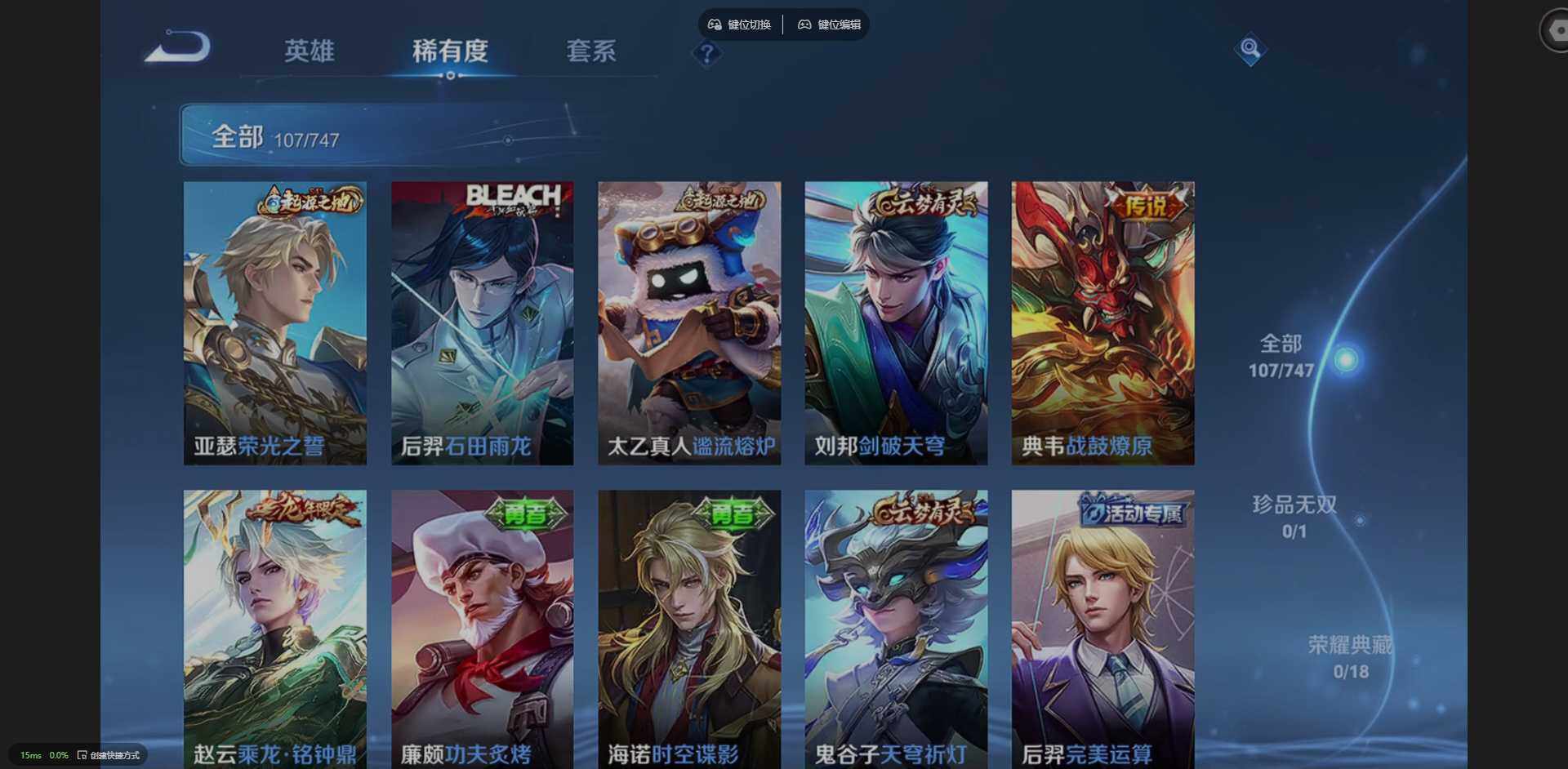实名: 可修改 贵族等级: V6 英雄数: 125 皮肤数: 107 传说皮: