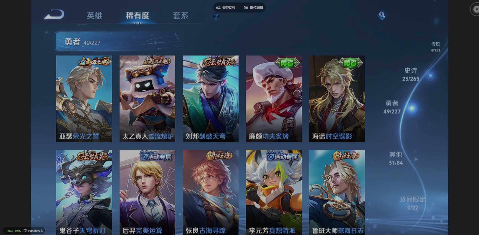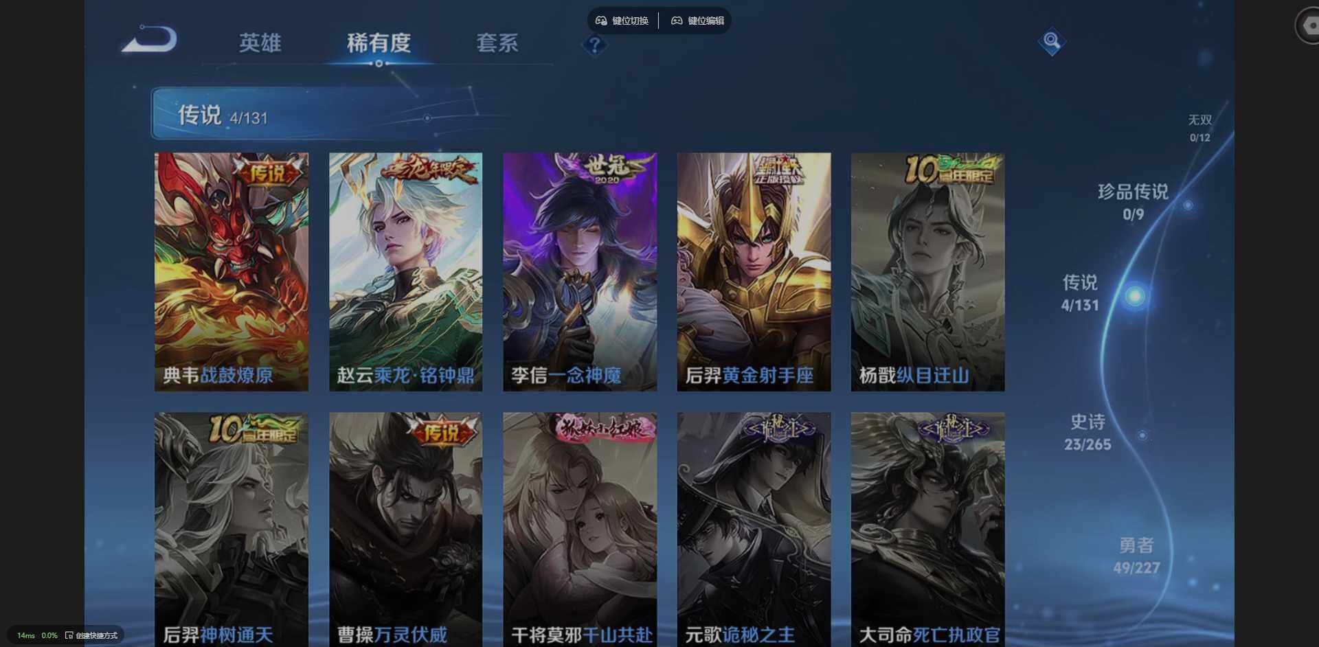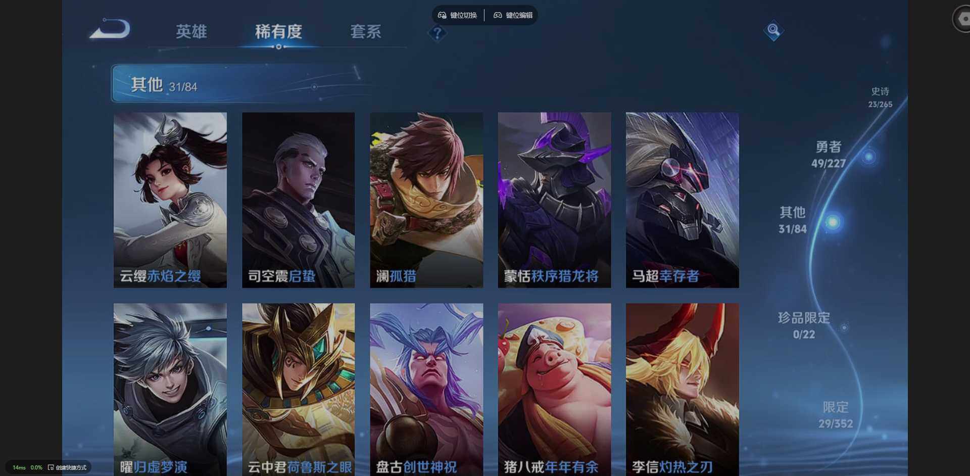 实名: 可修改 贵族等级: V6 英雄数: 125 皮肤数: 107 传说皮: