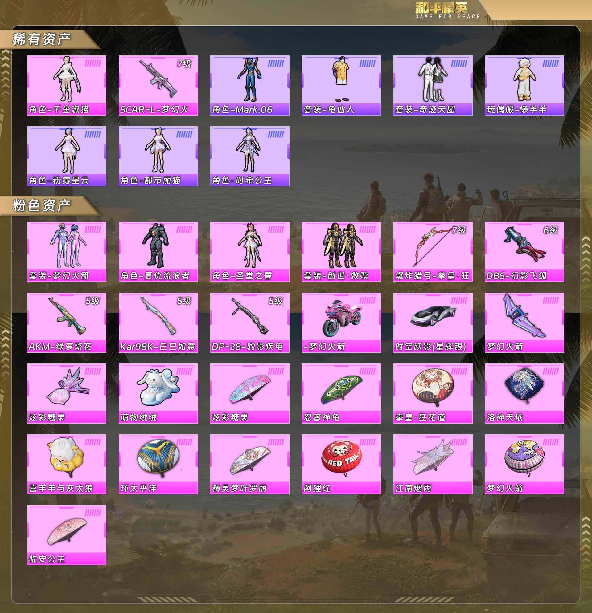 公主号-火箭少女/千金淑猫/粉雾星云/都市丽猫/时希公主/蓝螳螂/复仇流浪者/圣堂之誓/创世·救赎【枪皮】爆炸猎弓拳皇·狂花道7级/DBS幻影飞狐6级/AKM绿萝繁花5级/98K巳巳如意5级/DP28豹影疾电5级/SCARL梦幻火箭7级【载具】双人摩托梦幻火箭/时空跃影(星辉银) 没战神框(5粉套6粉枪2载具)HP4196-3粉色飞行器-49556热力值-4王牌印记-101套装-144枪皮