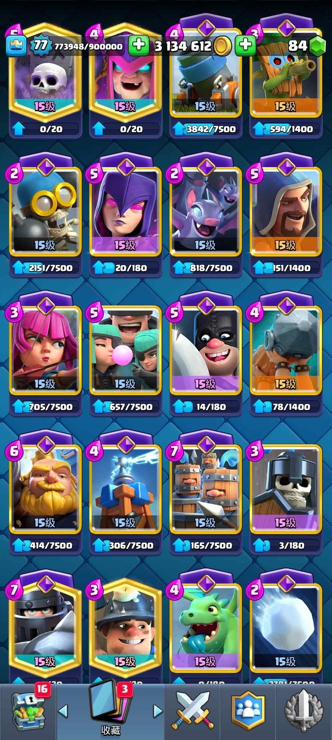 77级,16级20个(满级),64个15级,14级42个,3个精英卡,251个表情,满级觉醒