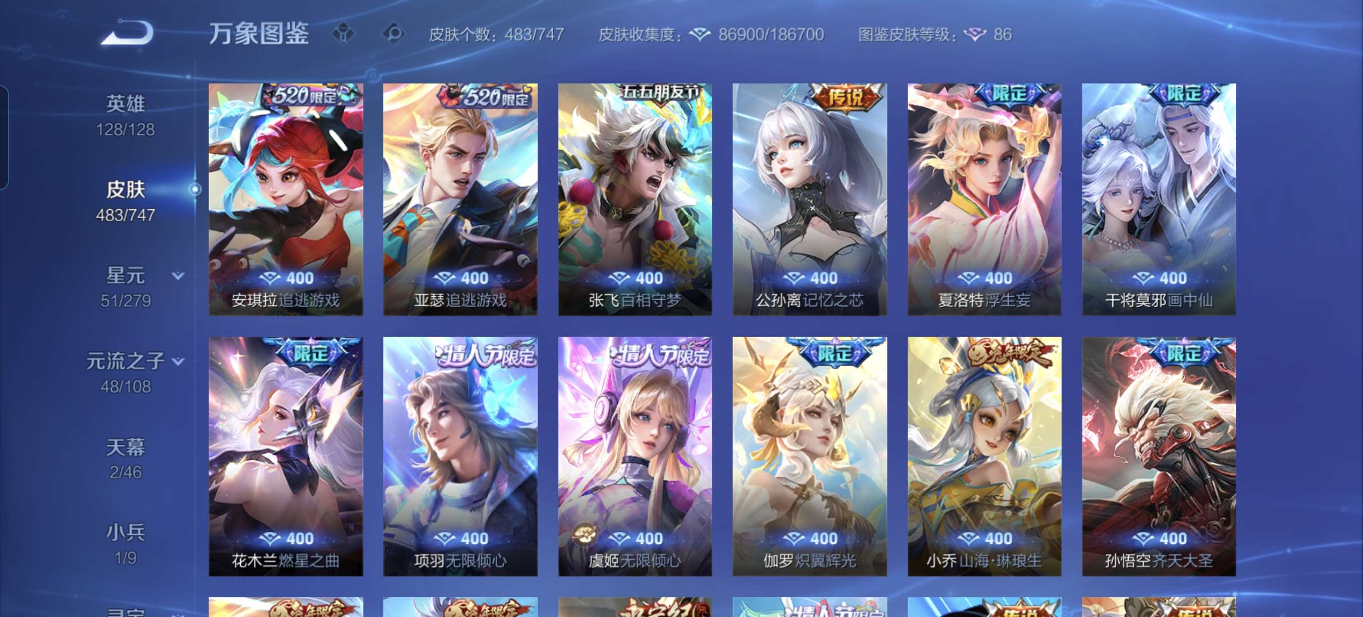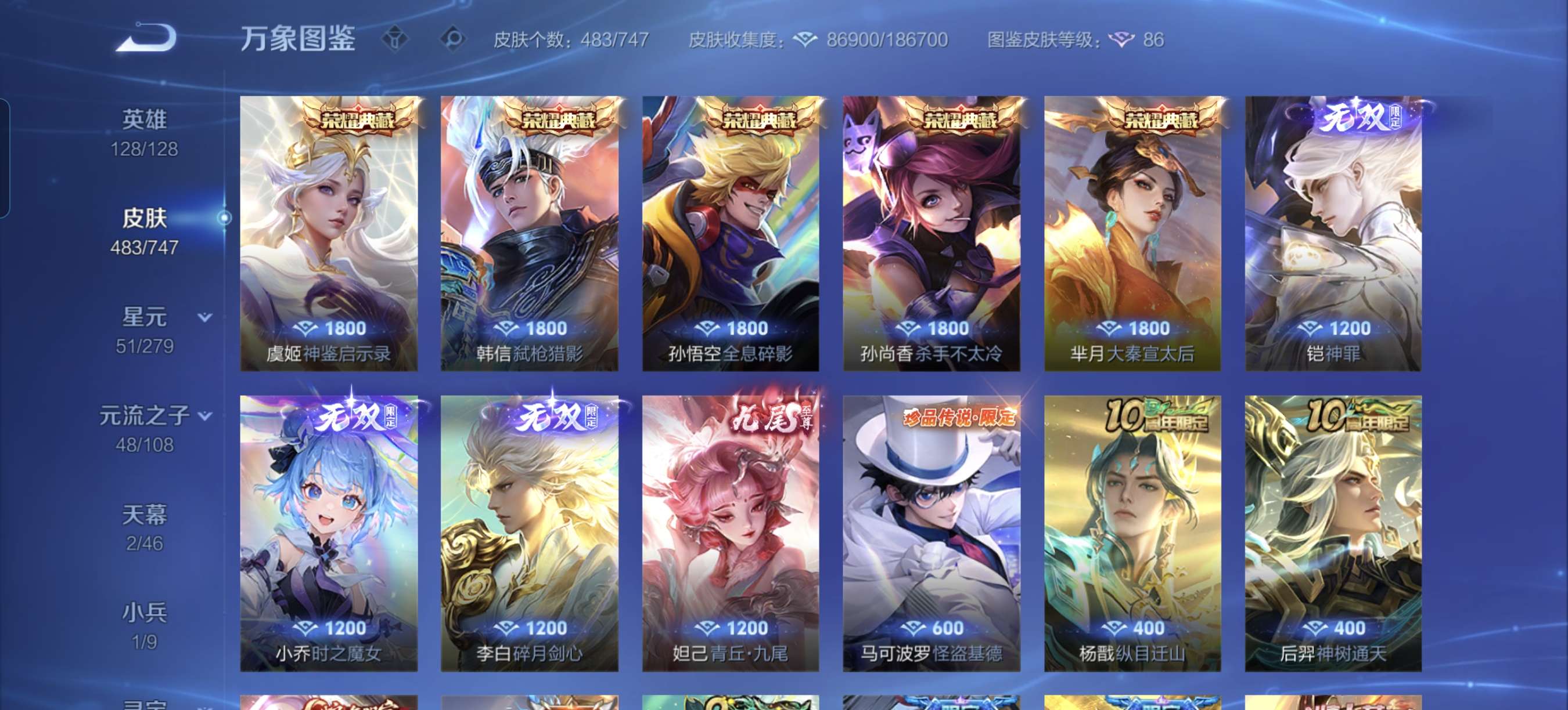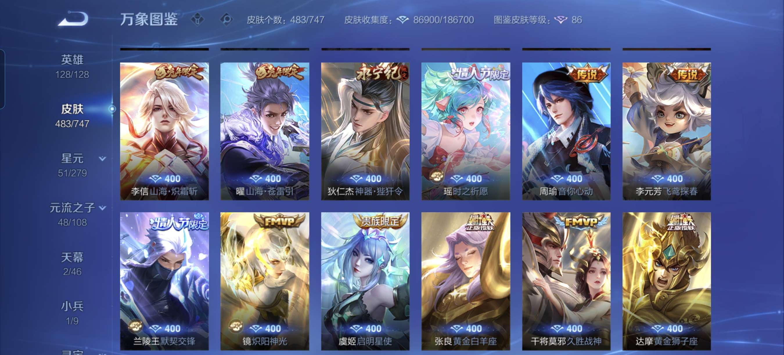 贵十典藏5个,武则天小兵加起来一共七水晶四无双皮肤,一个珍品传说,皮肤总数483、传说皮肤48