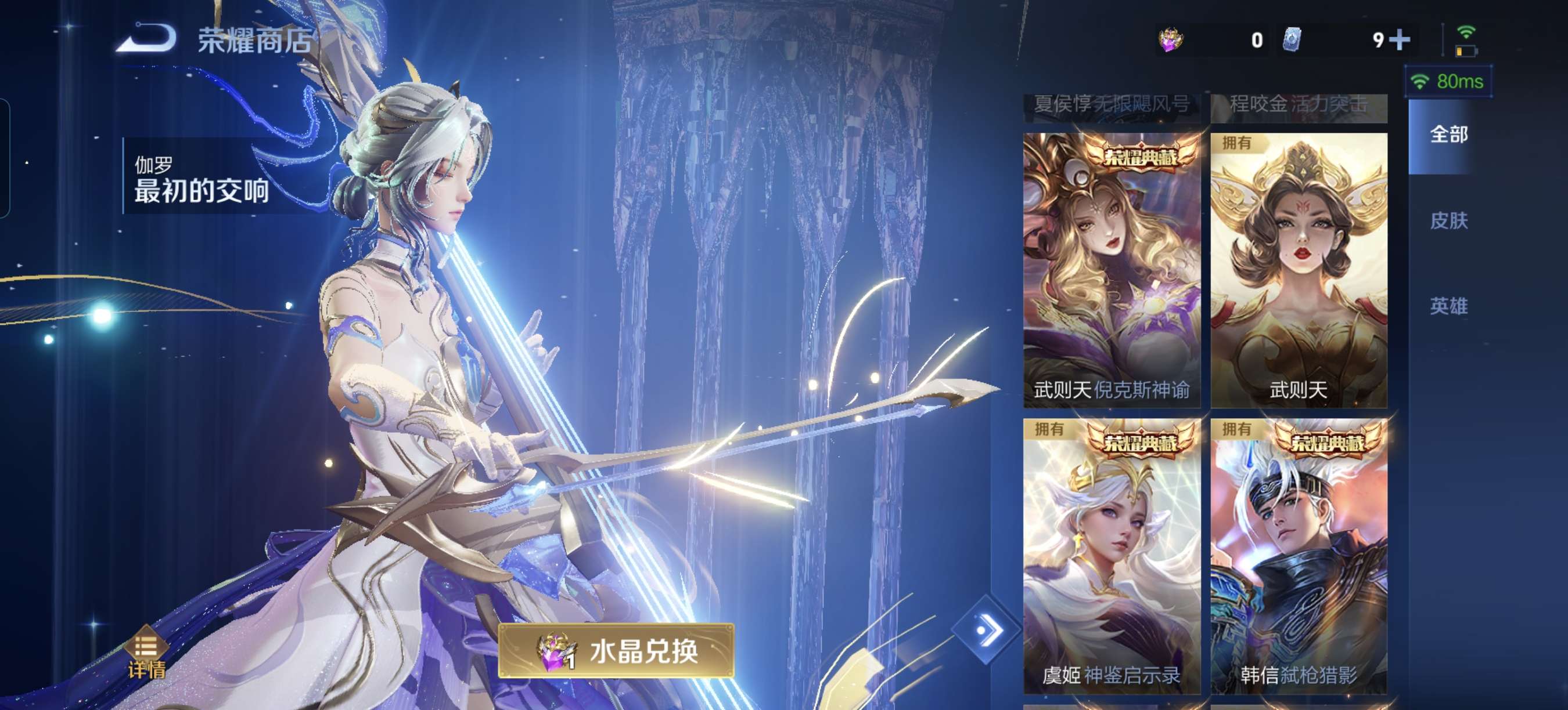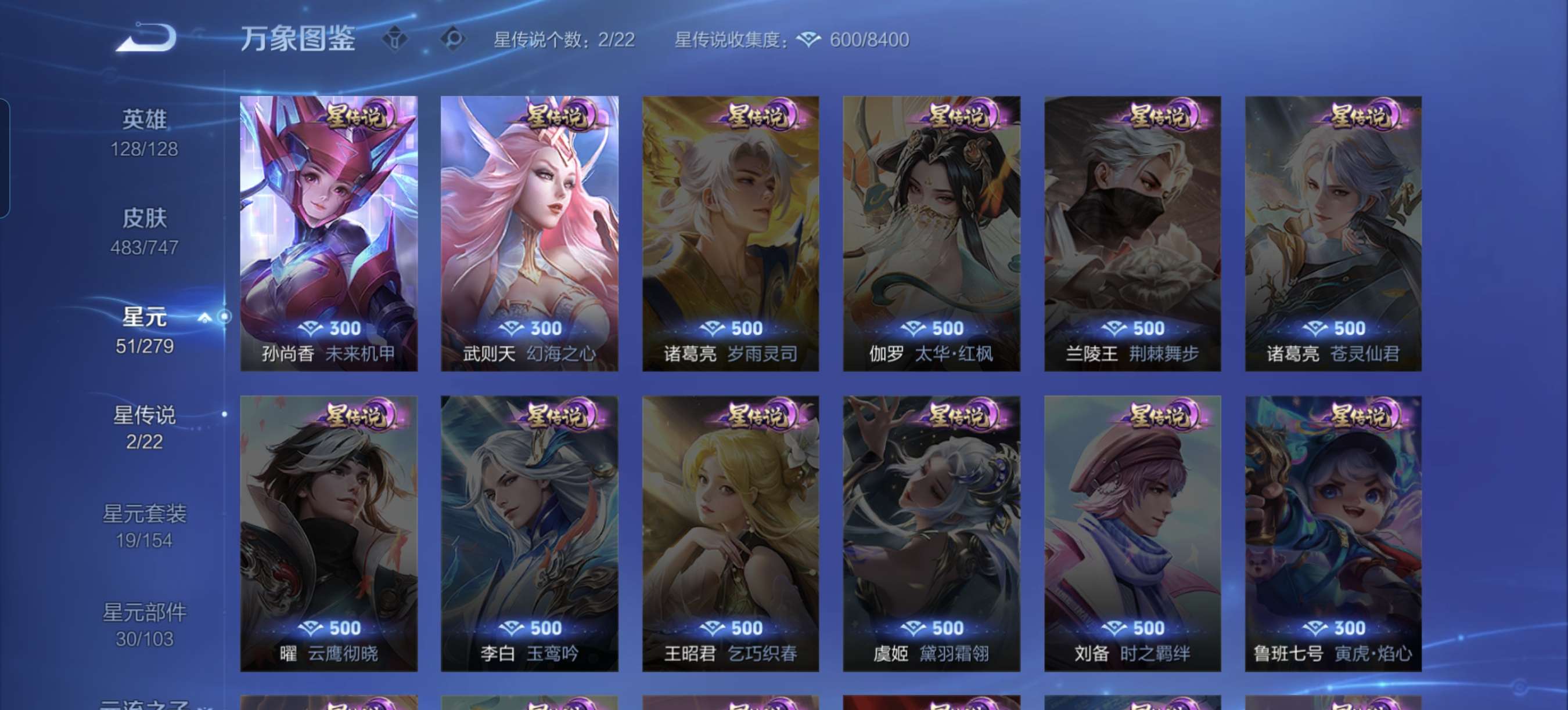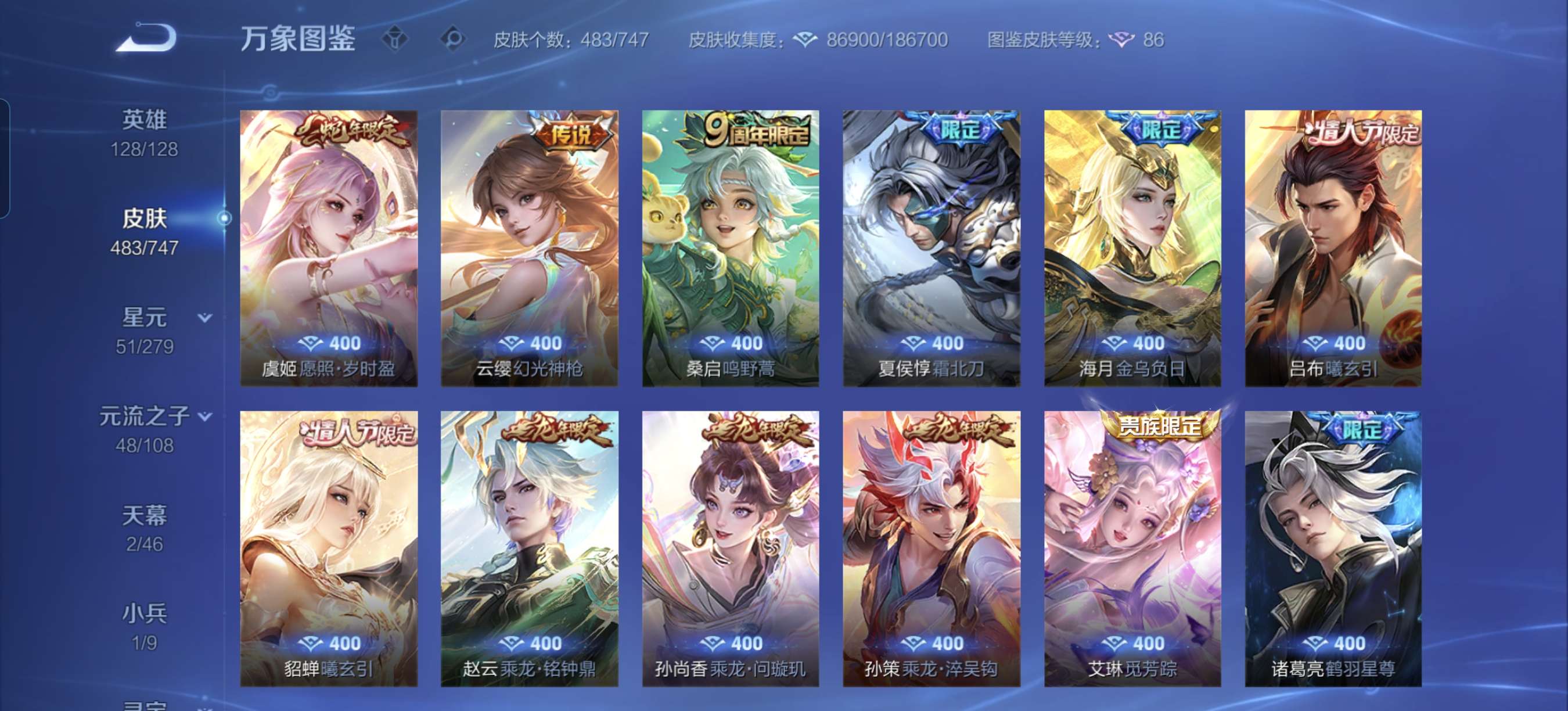 贵十典藏5个,武则天小兵加起来一共七水晶四无双皮肤,一个珍品传说,皮肤总数483、传说皮肤48