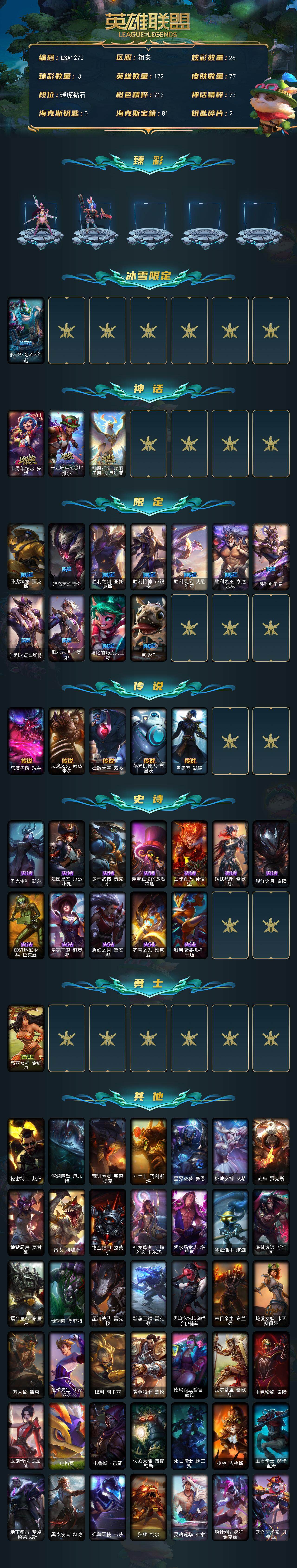 【LSA1273】172英雄/77皮肤/3神话/12限定/3臻彩/26炫彩/5传说/12史诗/钻石账号等级:488/玉剑传说舞剑仙承影/幻灵战斗队长厄运小姐勇气赞歌/霸天异形卡兹克丛林灾厄/邪恶圣诞老人维迦/十周年纪念安妮/十五周年纪念希维尔/神凰行者瑞羽圣凰艾尼维亚/卧虎藏龙贾克斯/暗裔英雄盖伦/胜利之剑亚托克斯/胜利枪神卢锡安/胜利凤凰艾尼维亚/胜利之王泰达米尔/胜利剑圣易/胜利之运崔斯特/胜利女神菲奥娜/波比的巧克力工坊/克格汪/恶魔男爵瑞兹/恶魔之刃泰达米尔/律政大亨蒙多/苹果机器人布里