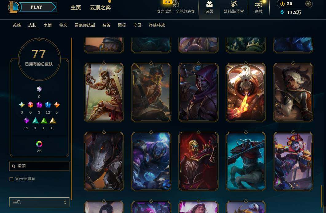 172英雄/77皮肤/3神话/12限定/3臻彩/26炫彩/5传说/12史诗/钻石账号等级:488/