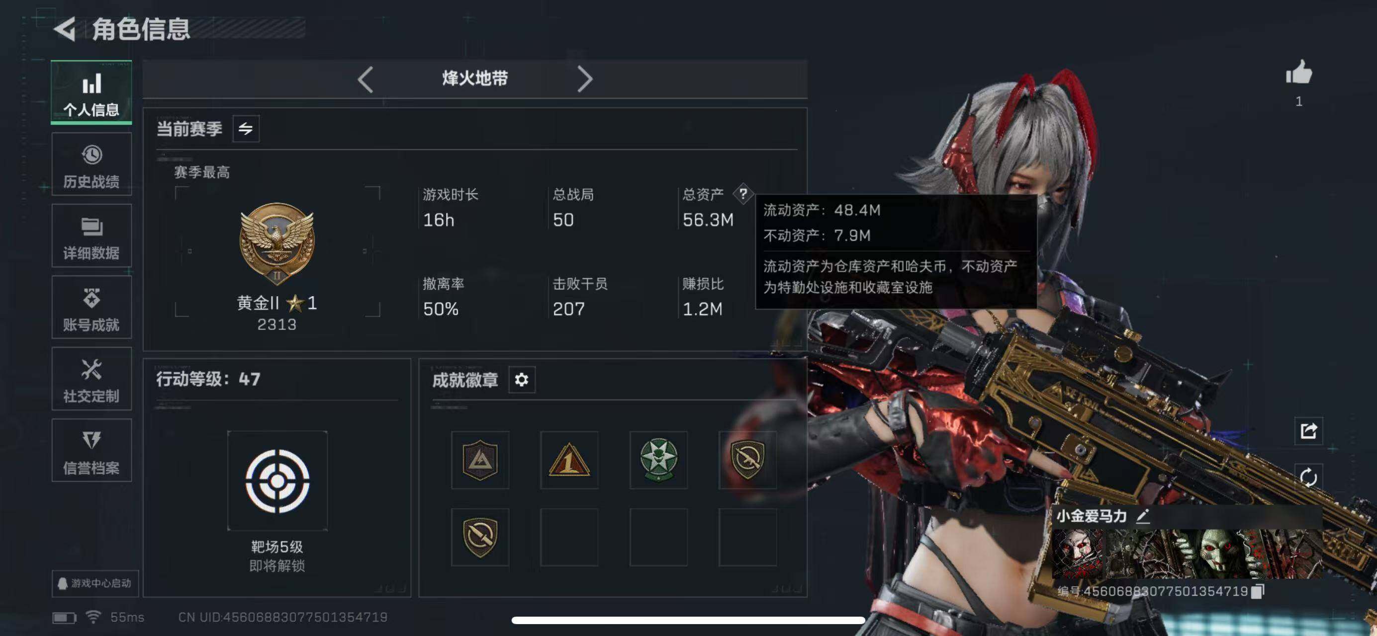 56m总资产-20808k哈伏币-47烽火等级-黄金-6战场等级-列兵