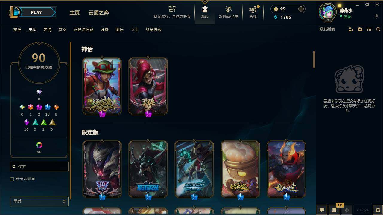172英雄/90皮肤/1终极/2神话/16限定/6臻彩/46炫彩/6传说/10史诗/未定级账号等级:191/