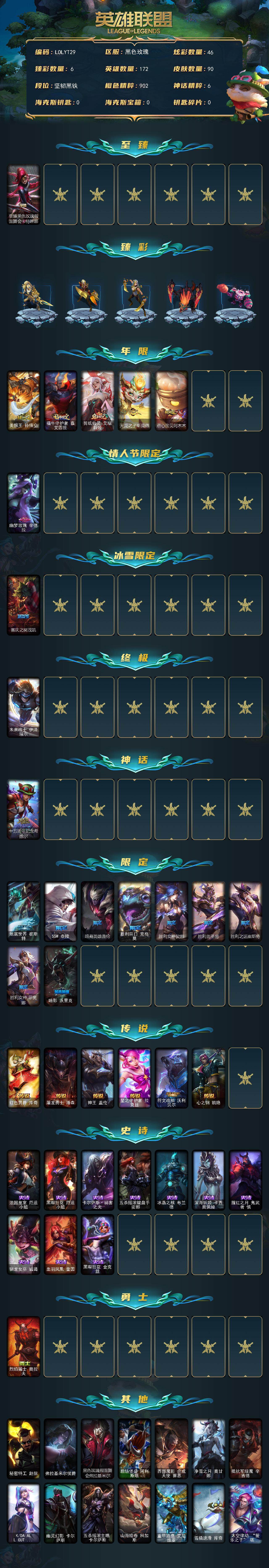 【LOLYT29】172英雄/90皮肤/1终极/2神话/16限定/6臻彩/46炫彩/6传说/10史诗/未定级账号等级:191/至臻黑色玫瑰假面舞会卡特琳娜/赵云子龙炫金将军/征服者韦鲁斯炫金/闭月之颜貂蝉炫金莲华/山海绘卷科加斯朱红/可爱可爱粉红红布里茨/黑夜使者嘉文四世白夜/美猴王孙悟空/福牛守护者嘉文四世/剪纸仙灵艾瑞莉娅/天龙之子斯莫德/点心宝贝阿木木/幽梦玫瑰辛德拉/喜庆之树茂凯/未来战士伊泽瑞尔/十五周年纪念希维尔/地底世界崔斯特/SSW泰隆/暗裔英雄盖伦/胜利巨口克格莫/胜利女神娑娜