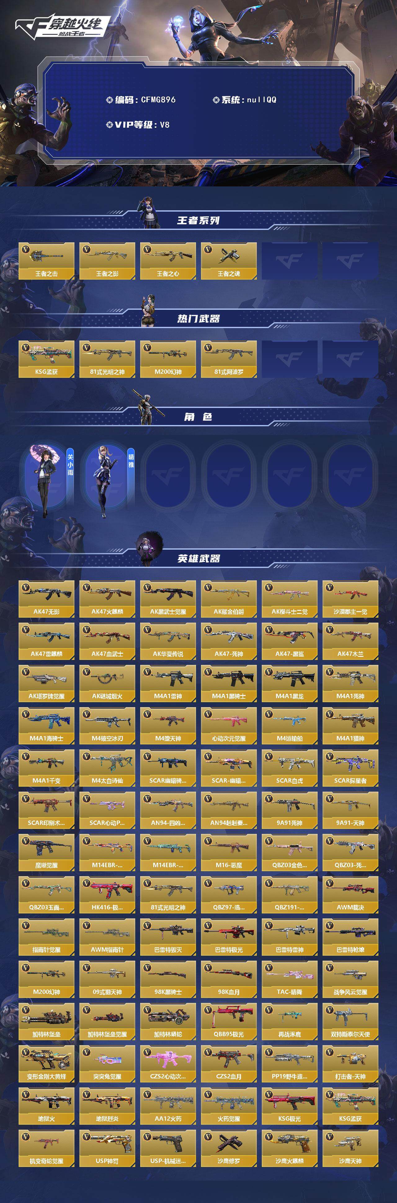 【CFMG896】VIP8/241V/4王者/王者之击/王者之影/王者之心/王者之魂/KSG-孟获/81式-光明之神/M200-幻神/81式-阿波罗/关小雨/晴雅/AK47-无影/AK47-火麒麟/AK47-黑武士觉醒/AK47-耀金伯爵/AK47-樱斗士-二觉/AK47-沙漠郡主-一觉/AK47-雷麒麟/AK47-血武士/AK47-华夏传说/AK47-死神/AK47-黑鲨/AK47-木兰/AK47-塔罗牌觉醒/AK47-谜城烟火/M4A1-雷神/M4A1-黑骑士/M4A1-黑龙/M4A1-死神