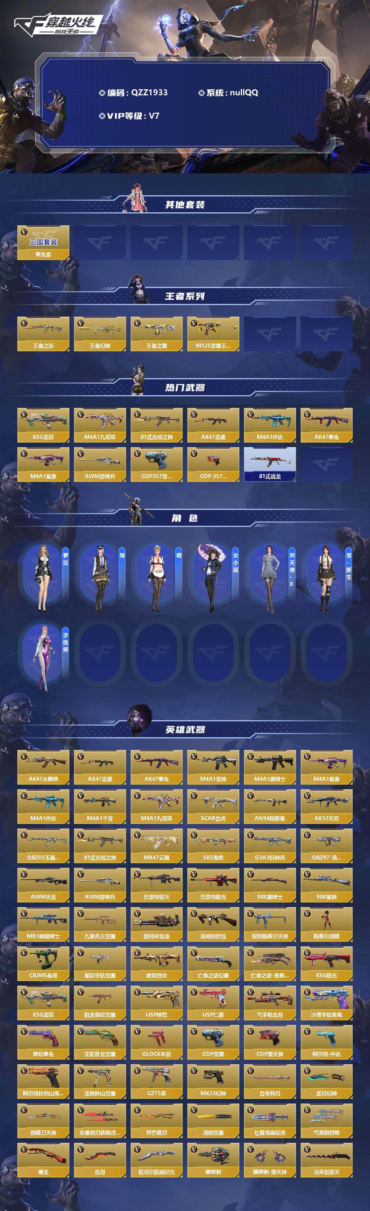【QZZ1933】VIP7/246V/奉先套/王者之影/王者幻神/王者之霆/M12S-雷霆王者/KSG-孟获/M4A1-九尾狐/81式-光明之神/AK47-孟德/M4A1-仲达/AK47-奉先/M4A1-星象/AWM-游骑兵/COP 357-雷霆/COP 357-堕天神/81式-战龙/萝拉/樱/瞳/关小雨/炽天使-X/零-新生/步练师/AK47-火麒麟/AK47孟德/AK47奉先/M4A1-雷神/M4A1-黑骑士/M4A1星象/M4A1仲达/M4A1-千变/SCAR Light-白虎/AN94-