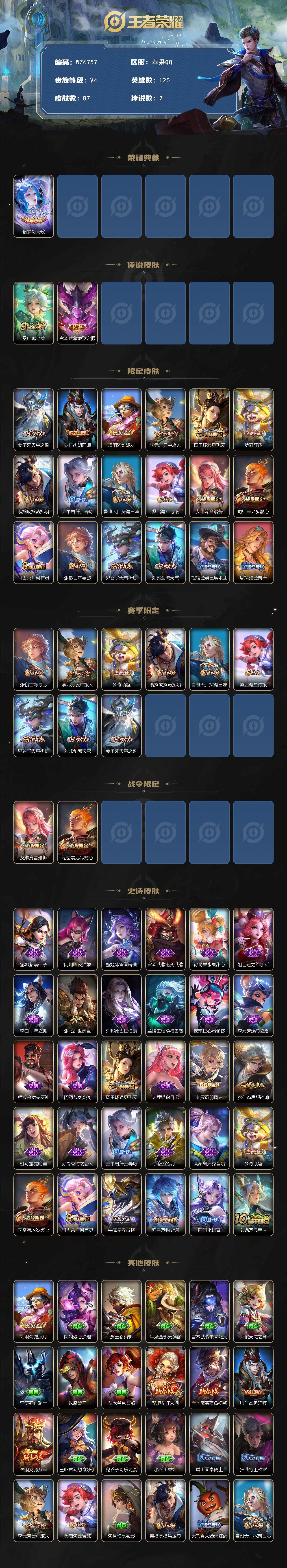 营地账号:/【小国标阿轲】V4-最强王者段位-120英雄-87皮肤-1典藏皮肤-2传说-30史诗