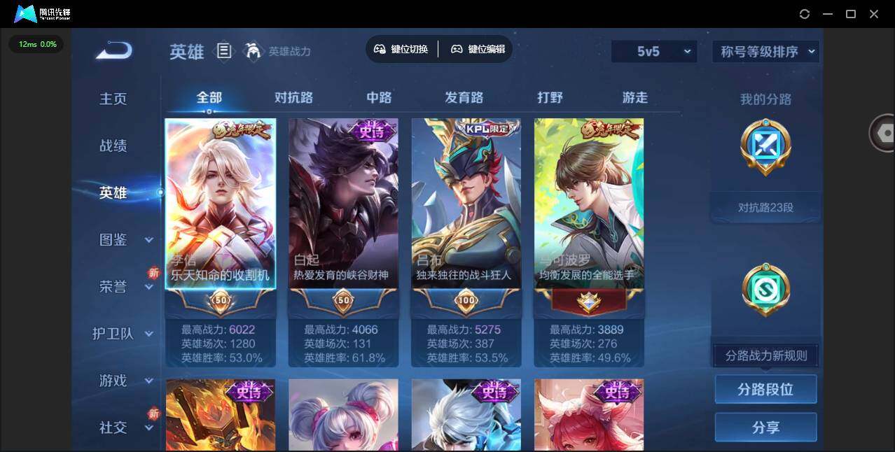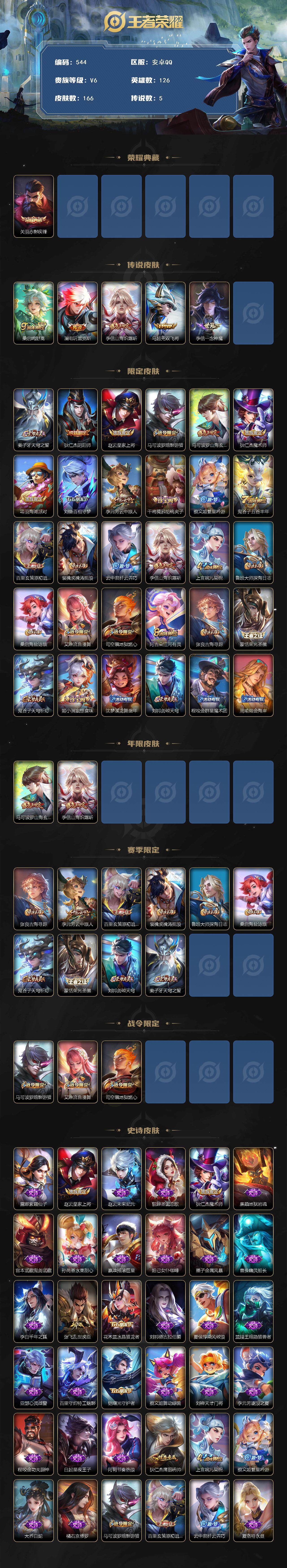 营地账号:/王者荣耀账号安卓Q-V6-最强王者段位-126英雄-166皮肤-1典藏皮肤-5传说-48史诗