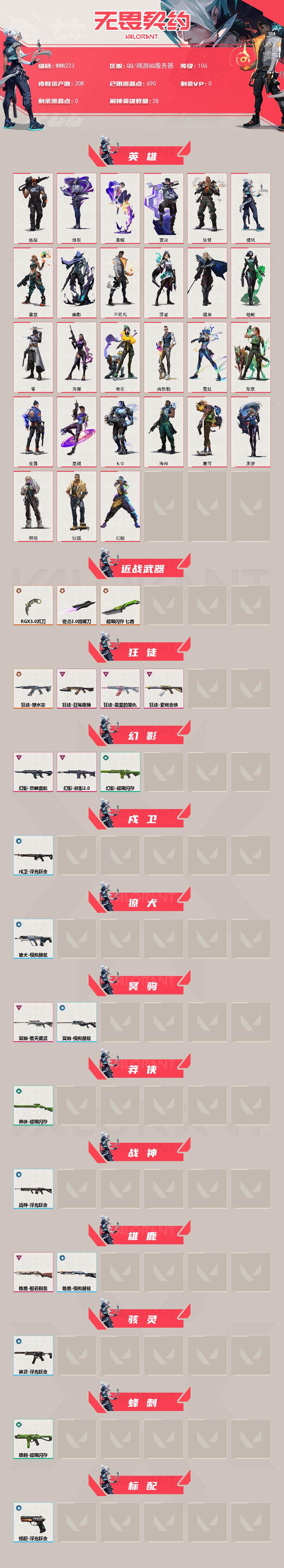 【WWN223】终极*6/卓越*7/皮肤*28/等级*106/段位:青铜/幻棱/炼狱/维斯/暮蝶/钛狐/壹决/铁臂/捷风/雷兹/幽影/不死鸟/贤者/猎枭/蝰蛇/零/芮娜/奇乐/尚勃勒/霓虹/斯凯/夜露/星礈/K/O/海神/盖可/黑梦/钢锁/近战武器-奇点//2.0 蝴蝶刀/近战武器-RGX 11z Pro//3.0 爪刀/近战武器-超限闪存 匕首/狂徒-塑水宗/狂徒-盖亚的复仇/狂徒-日冕雄师/狂徒-紫阙金琅/幻影-异鳞魔蛇/幻影-掠影//2.0/幻影-超限闪存/戍卫-浮光跃金/獠犬-模拟赫兹/