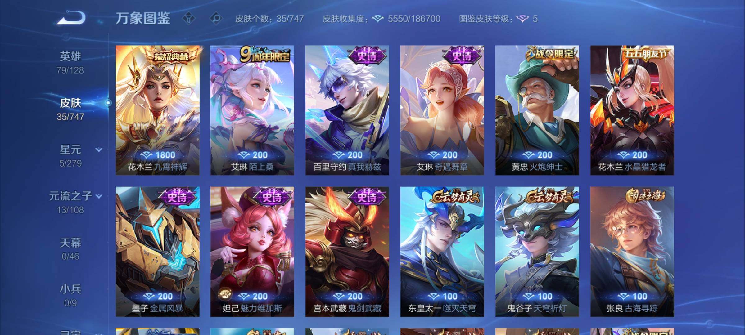 可换绑 五级铭文80 可二次CD15170 安卓Q-V4-35皮肤-1典藏皮肤-9史诗【荣耀典藏】:花木兰九霄神辉【限定皮肤】:芈月幻夜卜梦,达摩沙漠行僧,项羽海滩派对,兰陵王金庭之子,李元芳云中旅人,黄忠火炮绅士,苏烈千军破阵,沈梦溪大漠名商,鲁班大师探海日志,艾琳女武神,张良古海寻踪,鬼谷子天穹祈灯【赛季限定】:达摩沙漠行僧,兰陵王金庭之子,张良古海寻踪,李元