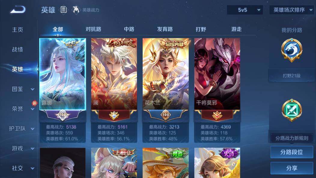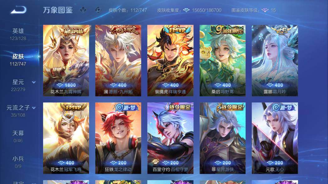 非常好的传说小号出安卓Q-V6-123英雄-112皮肤-1典藏皮肤-5传说-26史诗 花木兰九霄神辉 露娜霜月吟加按键 裴擒虎祥瑞亨通加按键 澜愿照九州拓
