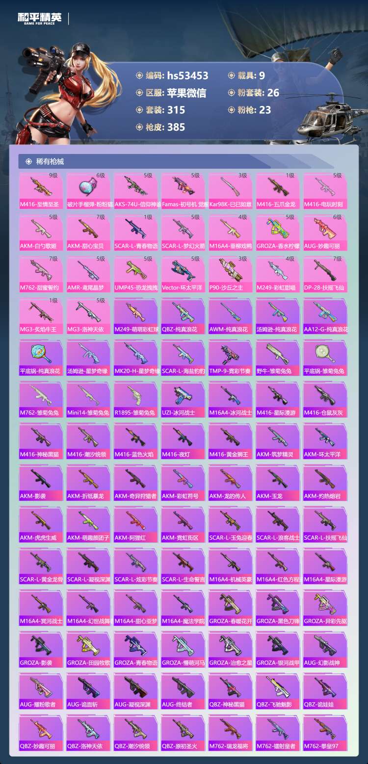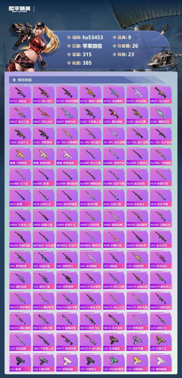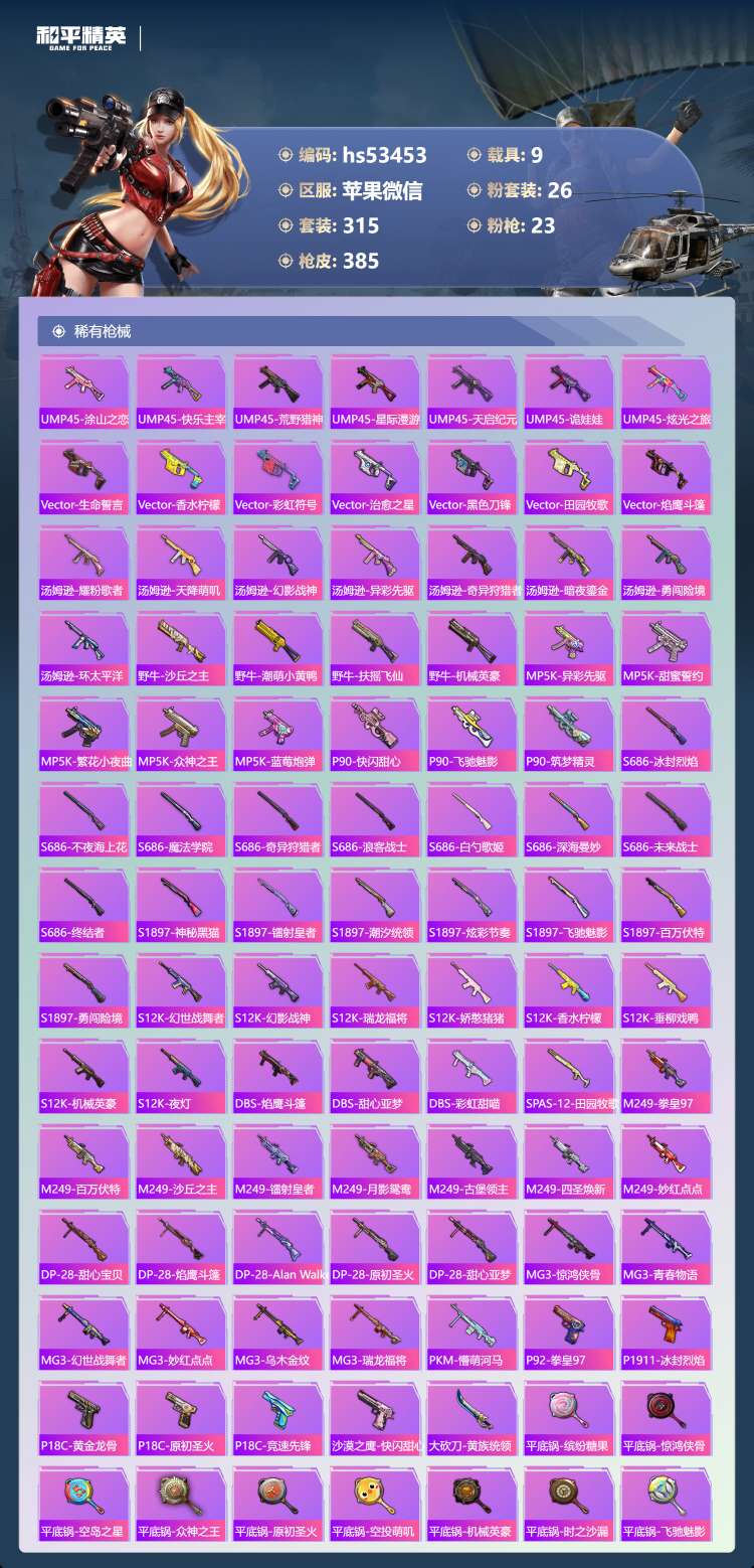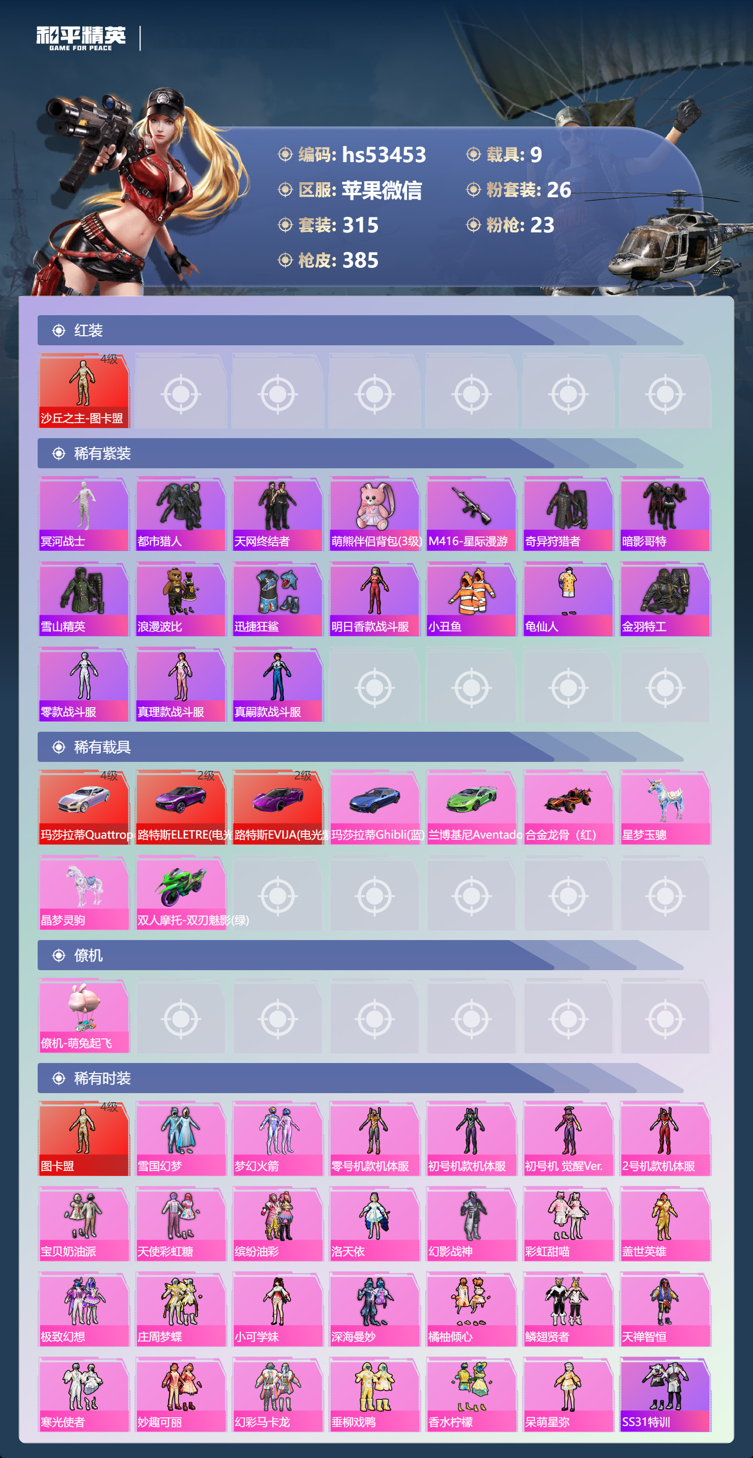 hs53453 苹果微-26王牌印记-有战神框-1红装-26粉装-23特效枪-9载具-170376