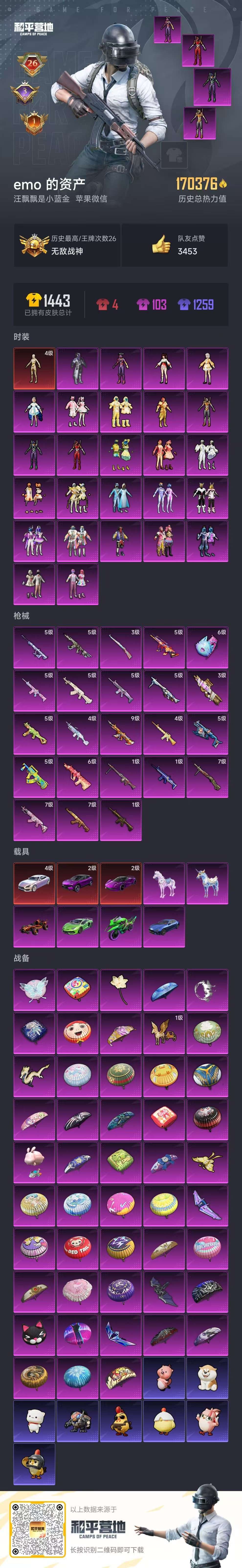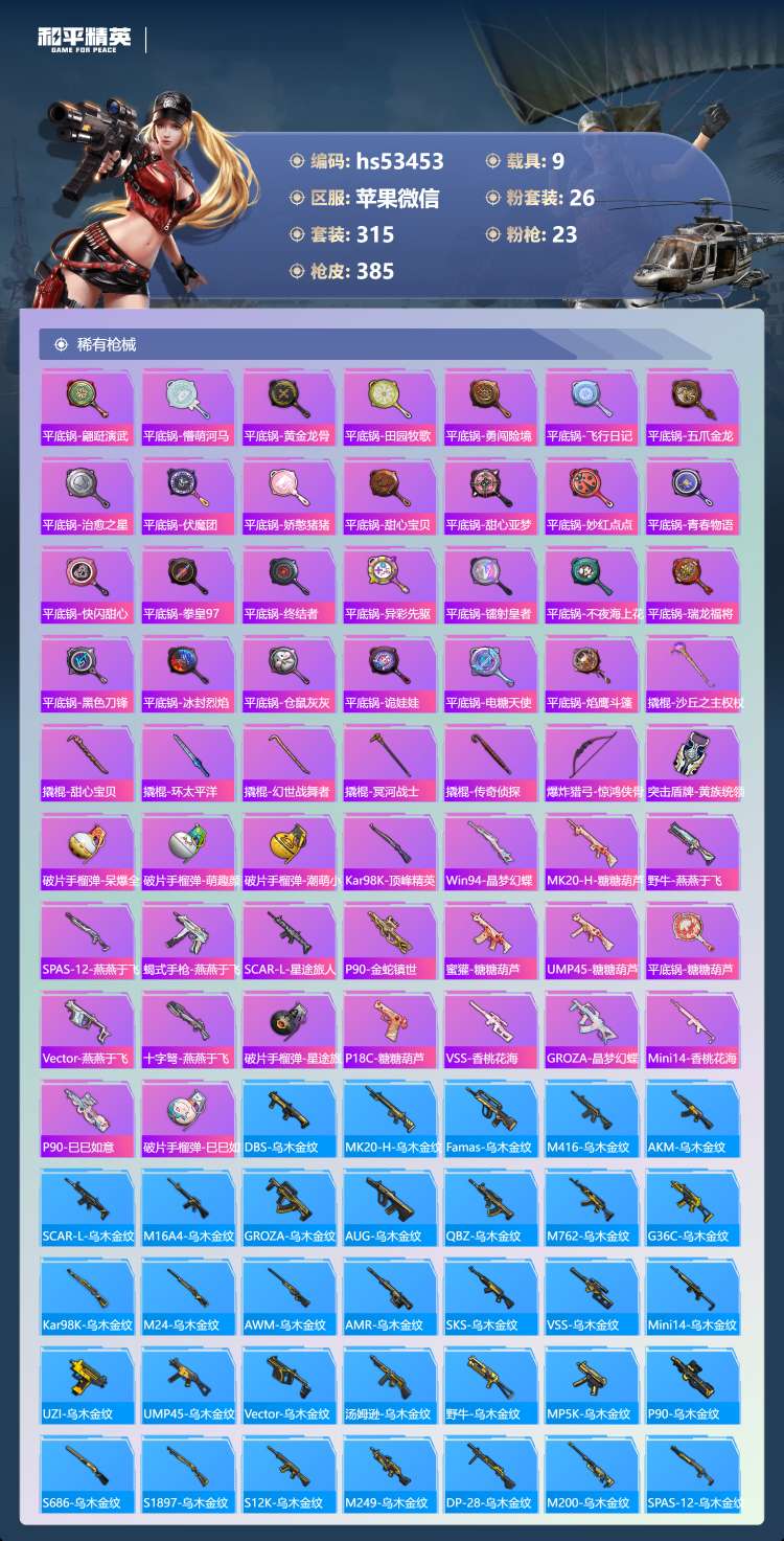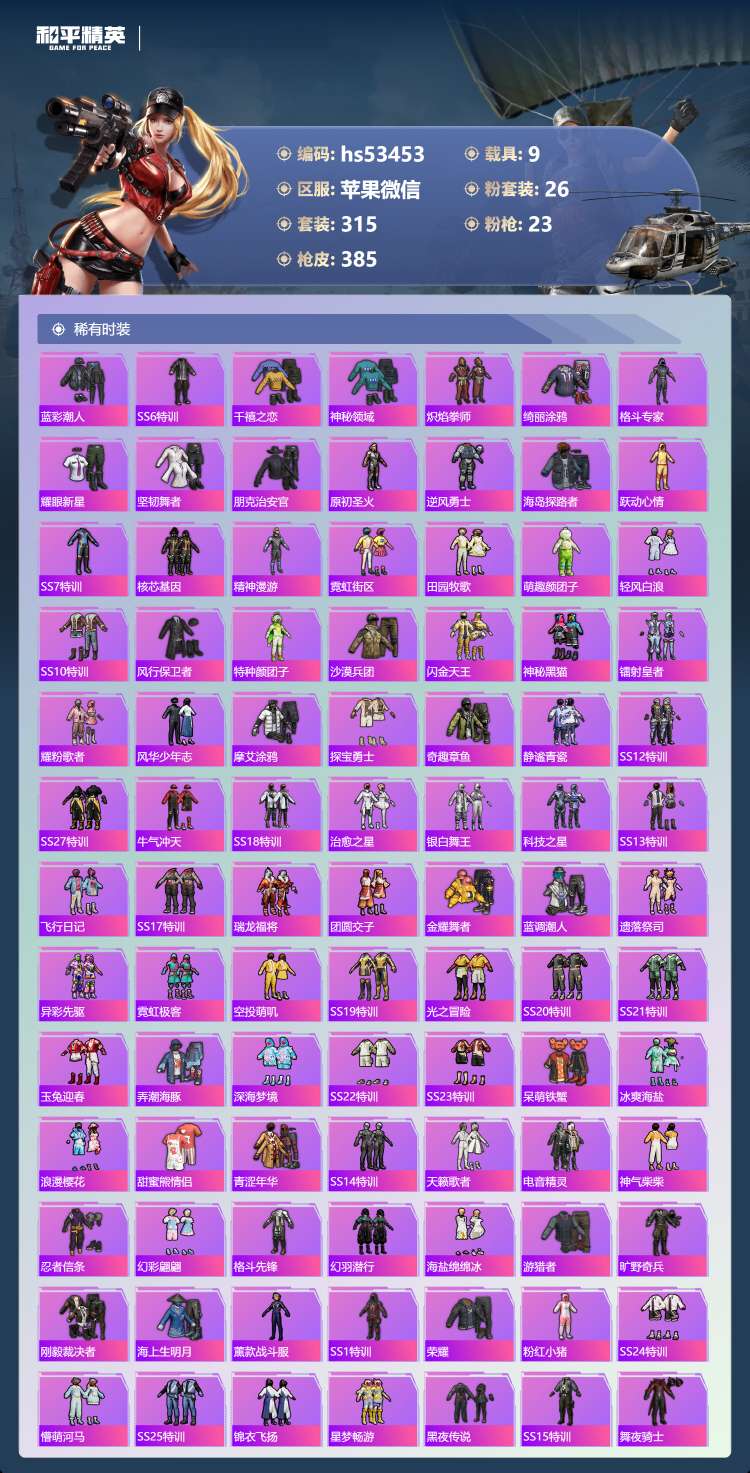 hs53453 苹果微-26王牌印记-有战神框-1红装-26粉装-23特效枪-9载具-170376