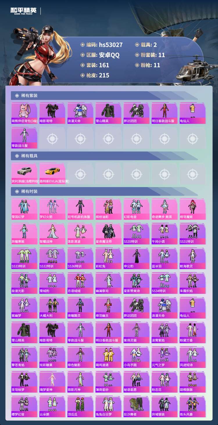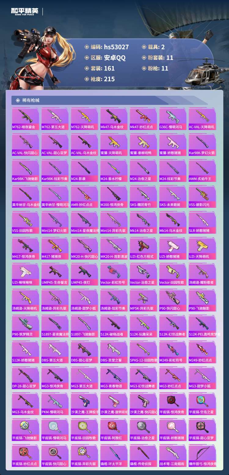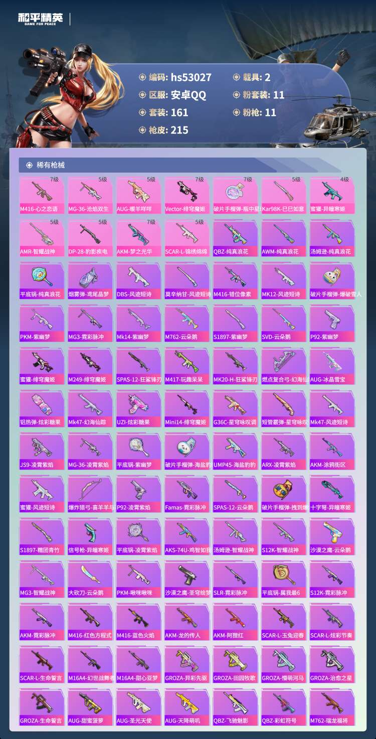 hs53027 安卓手Q-12王牌印记-11粉装-11特效枪-2载具-79754热力值-161套装-