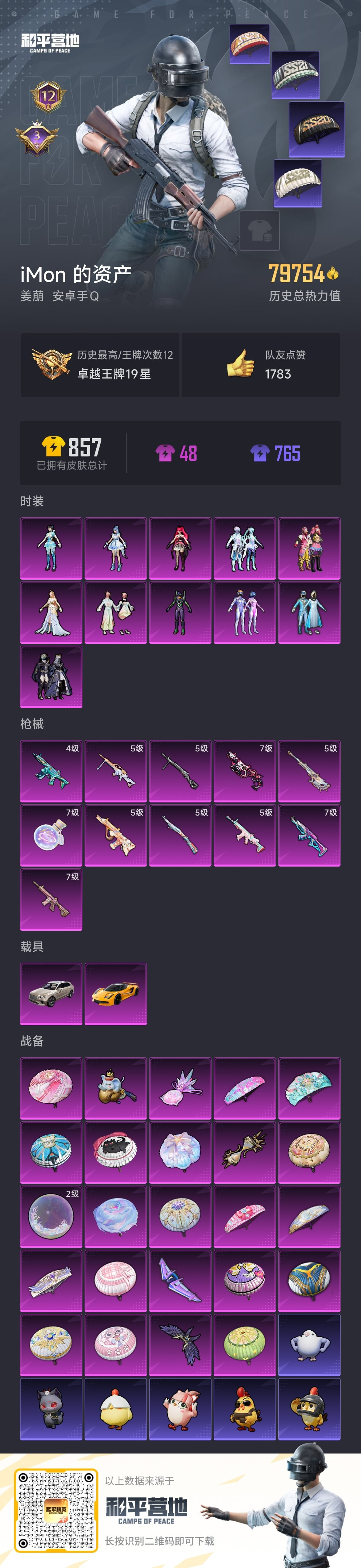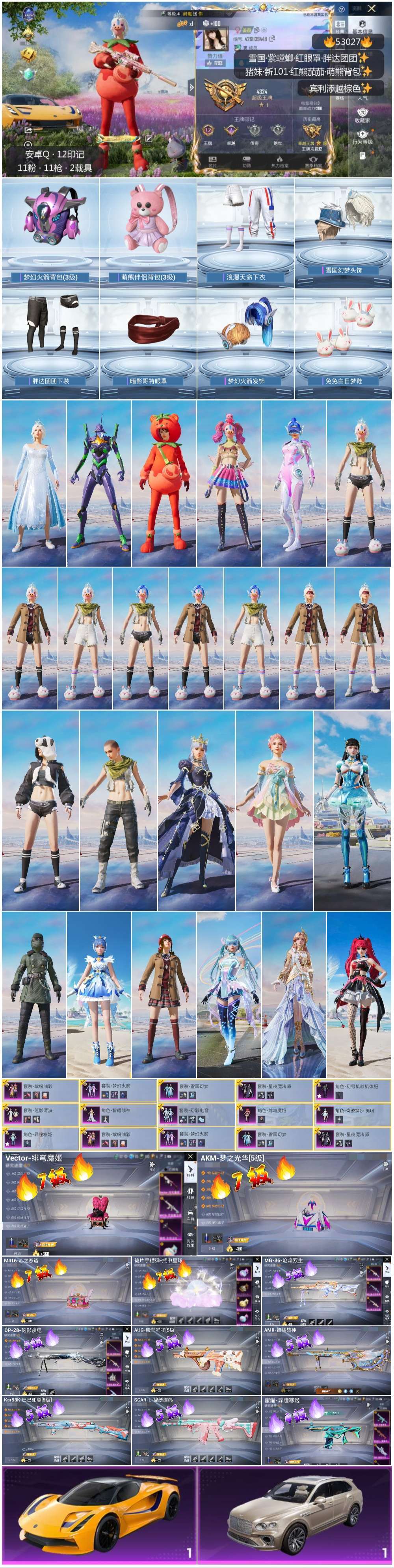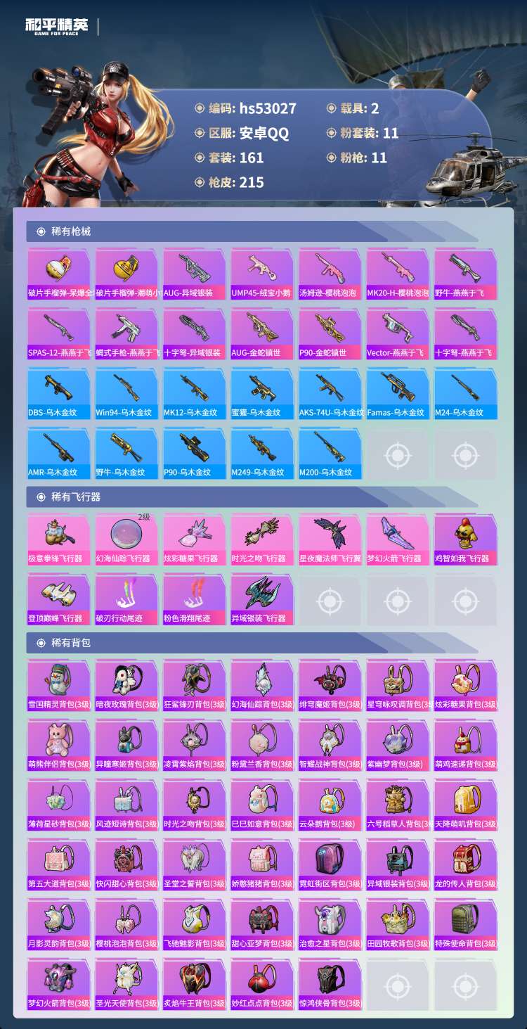 hs53027 安卓手Q-12王牌印记-11粉装-11特效枪-2载具-79754热力值-161套装-