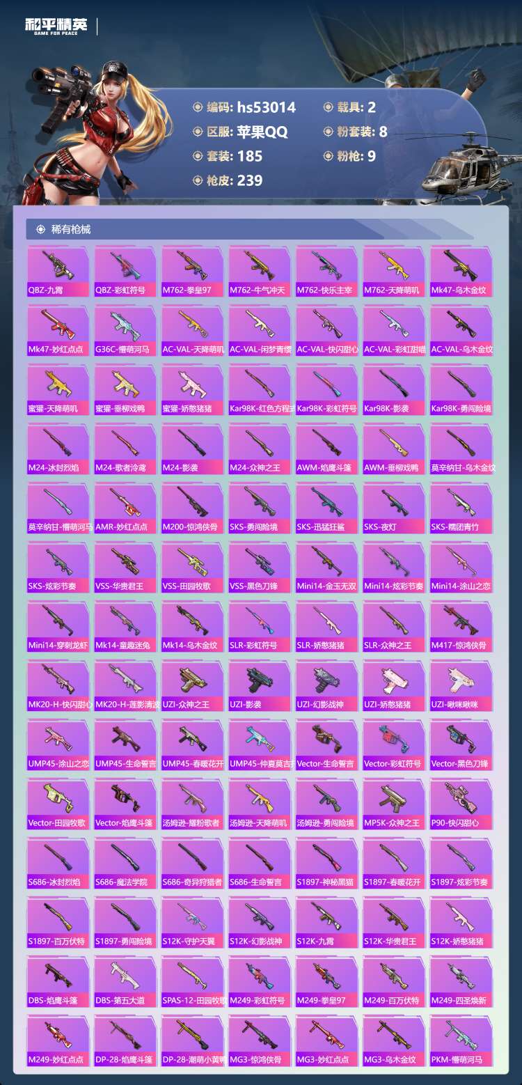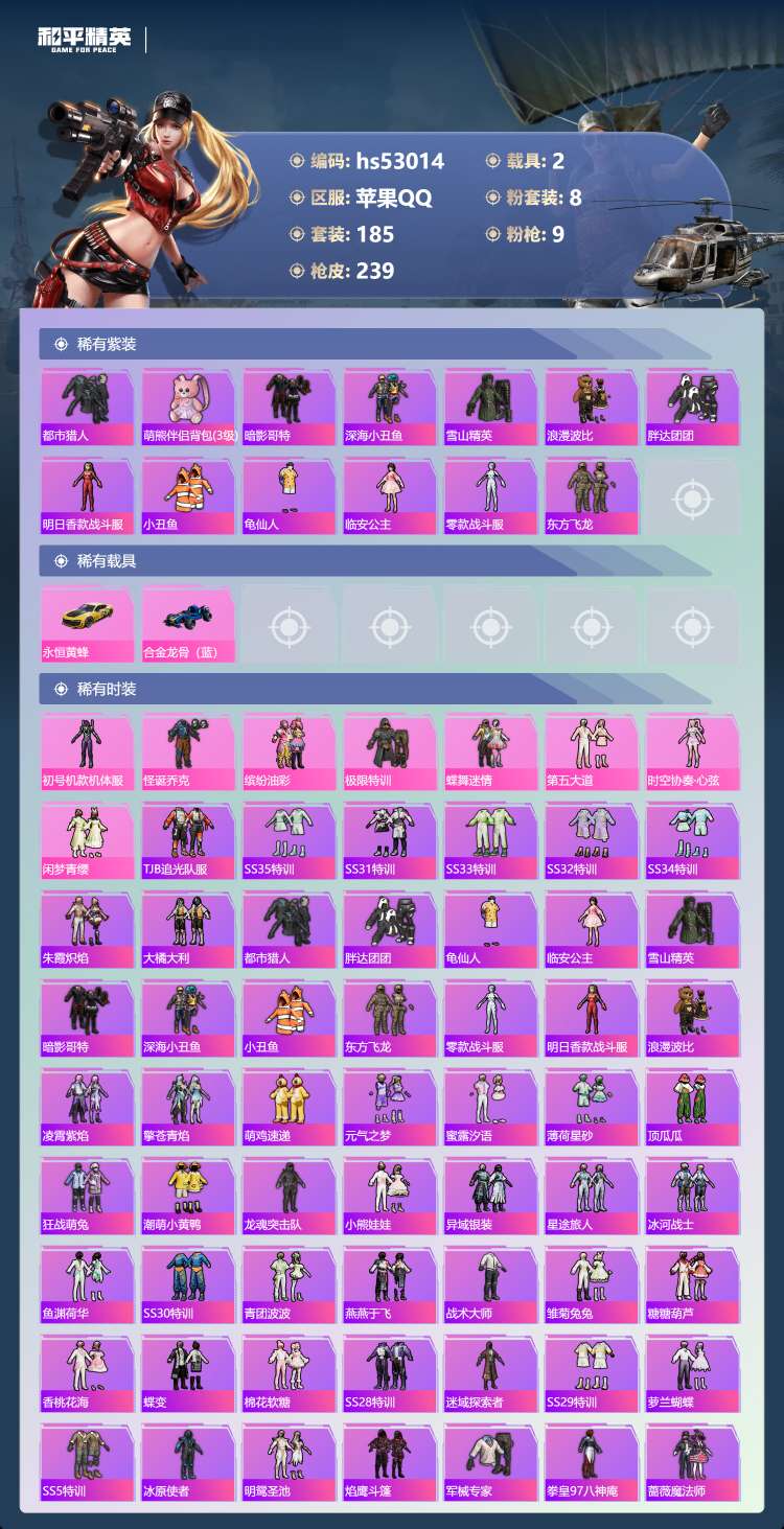 hs53014 苹果手Q-15王牌印记-8粉装-9特效枪-2载具-80831热力值-185套装-23