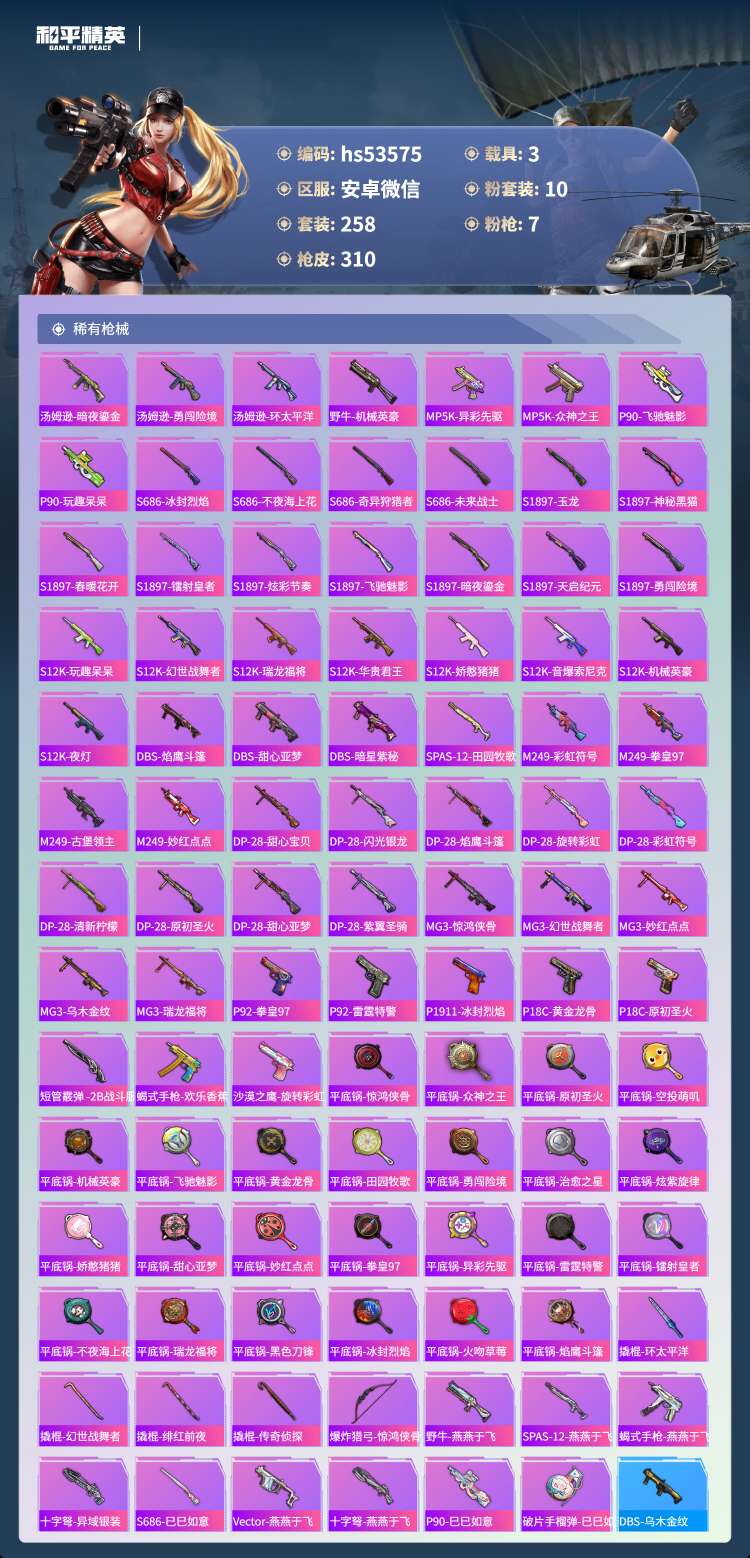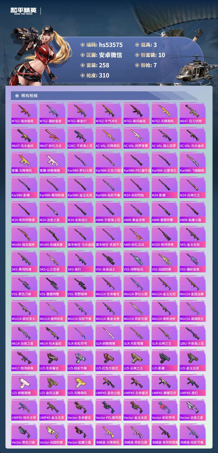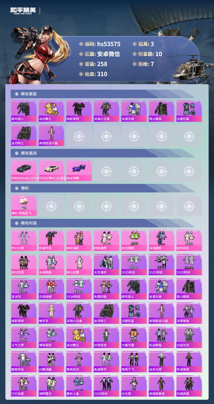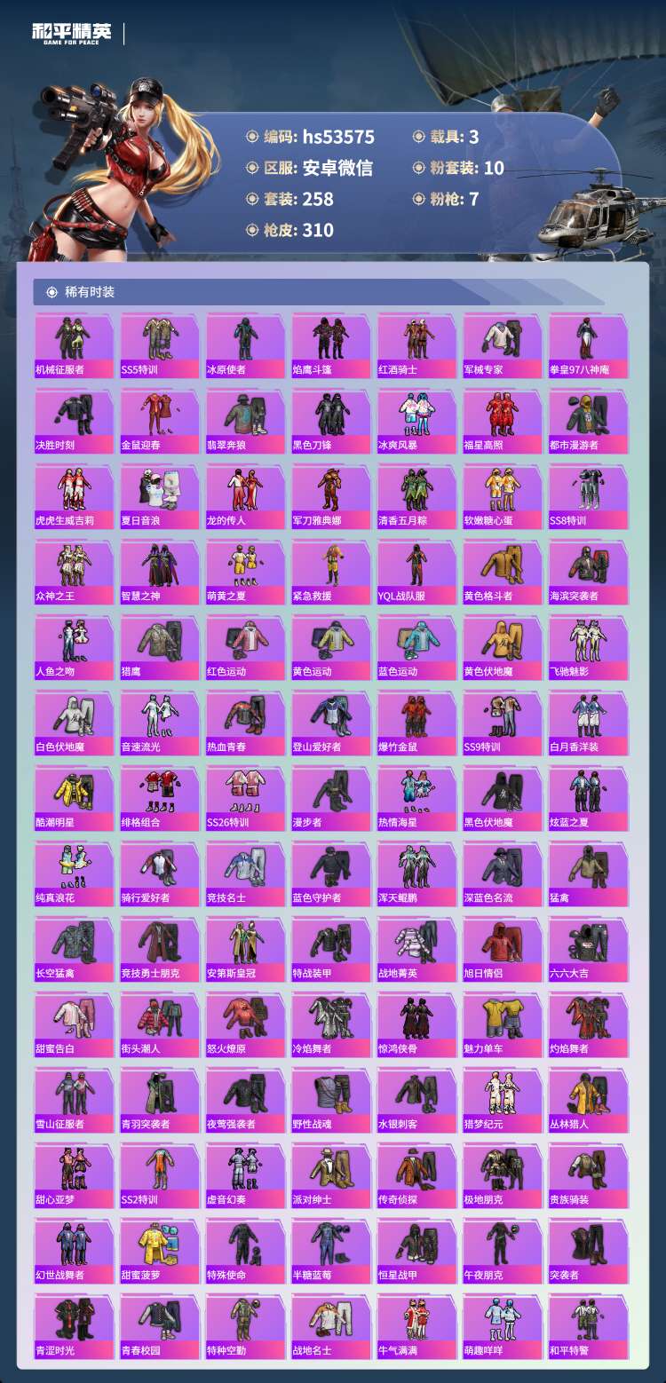 hs53575 安卓微-9王牌印记-10粉装-7特效枪-3载具-106178热力值-258套装-3