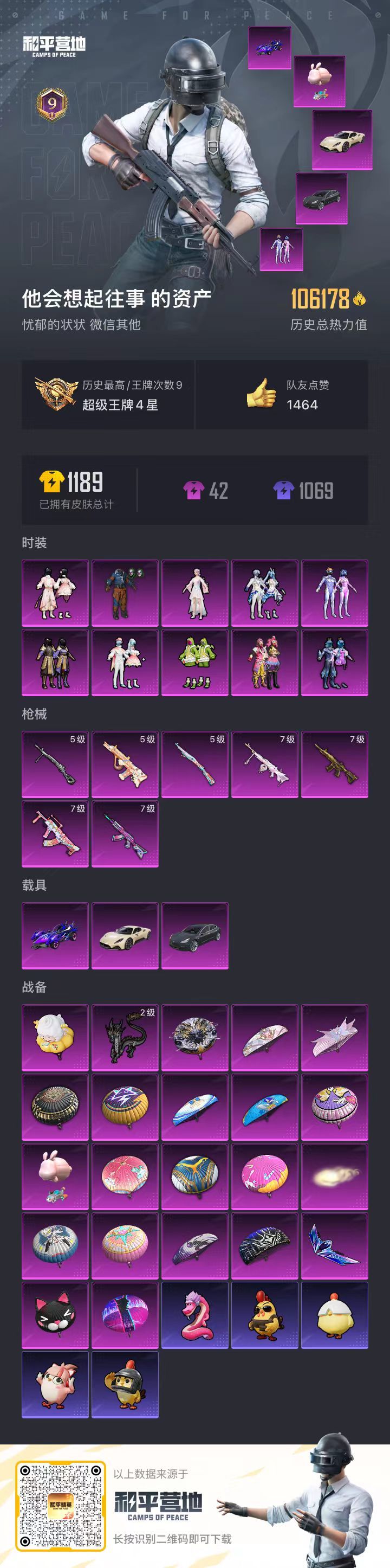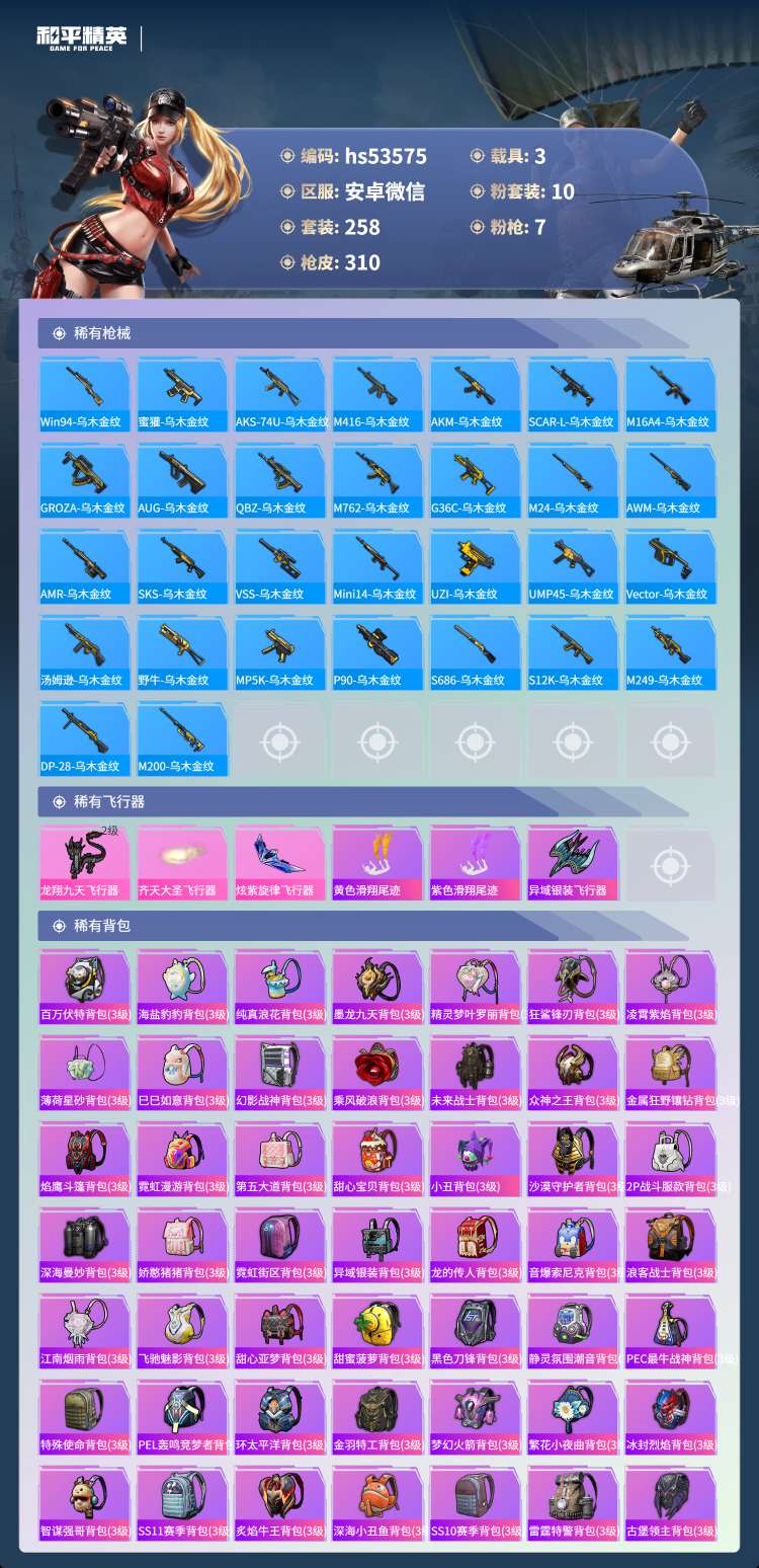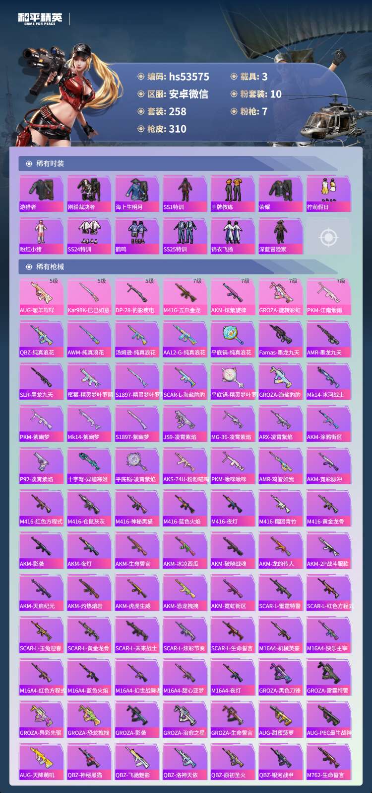 hs53575 安卓微-9王牌印记-10粉装-7特效枪-3载具-106178热力值-258套装-3