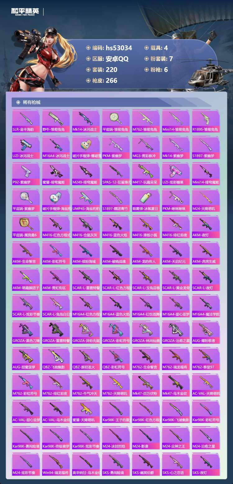 hs53034 安卓手Q-23王牌印记-1红装-7粉装-6特效枪-4载具-88415热力值-220套