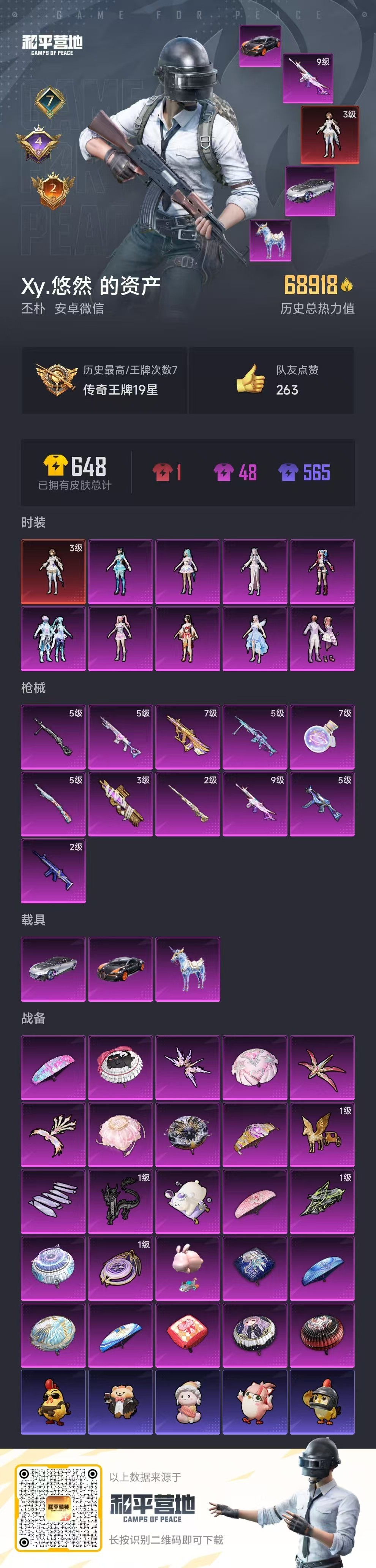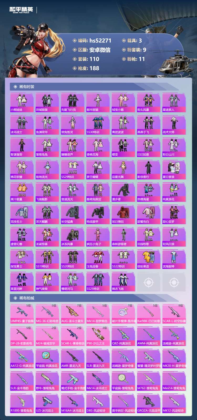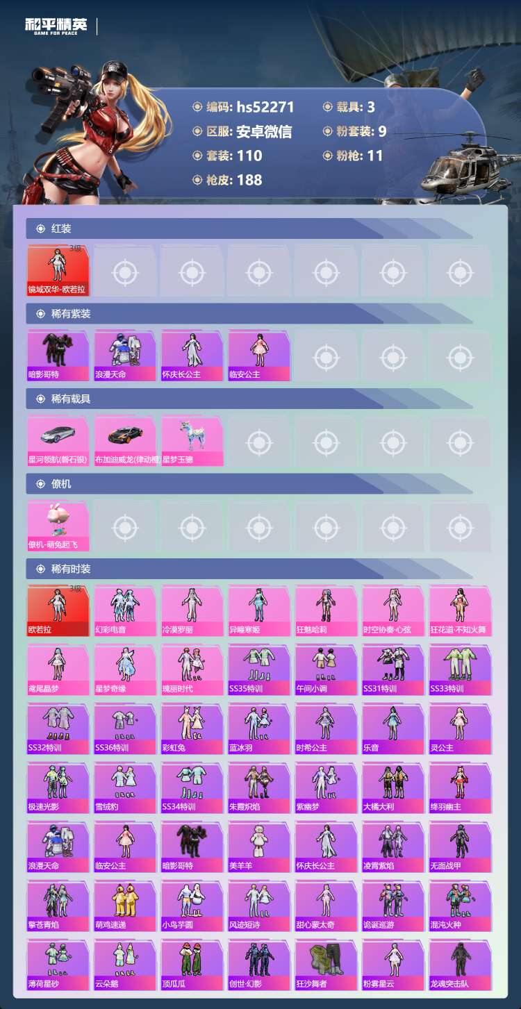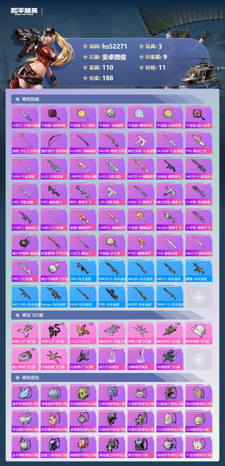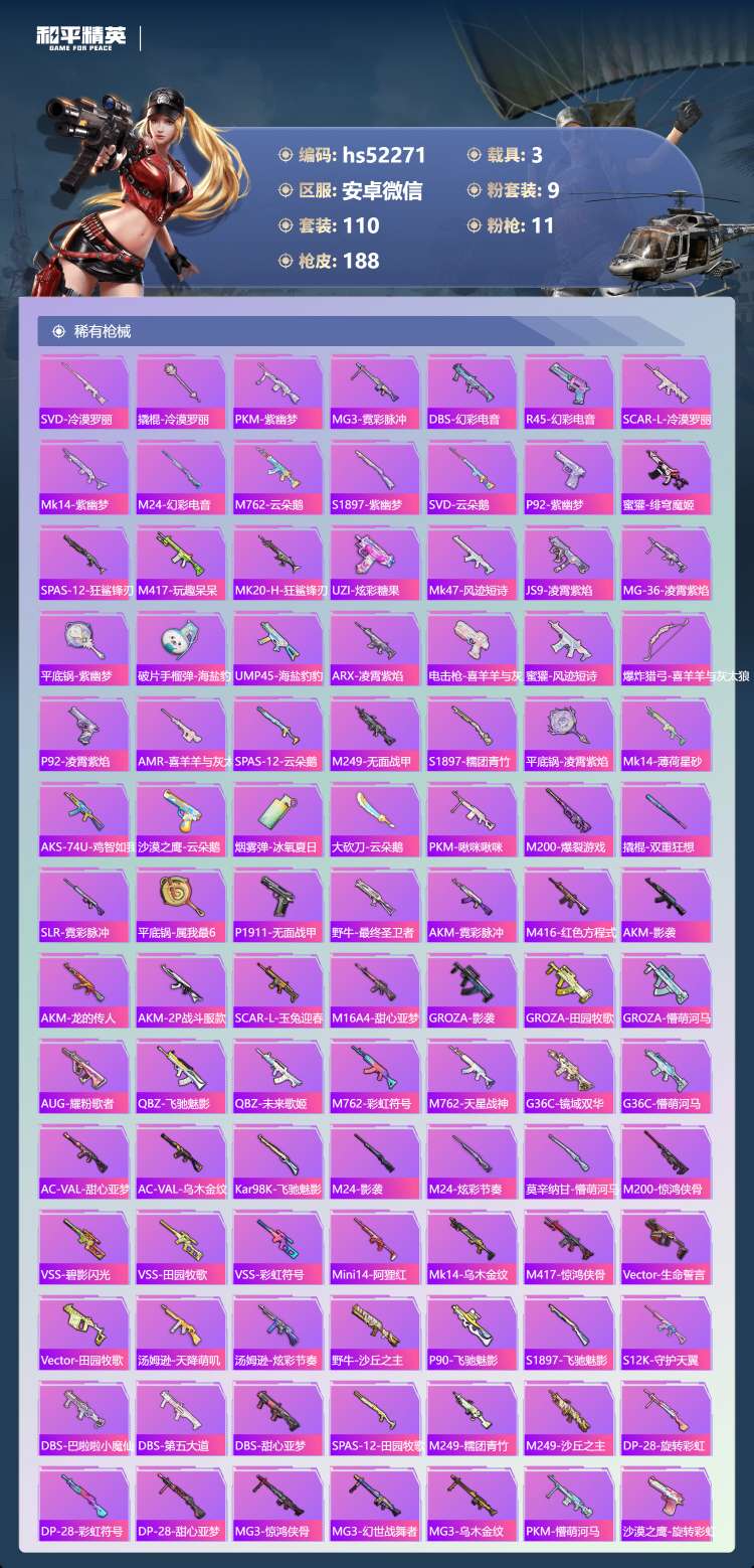 hs52271 安卓微-7王牌印记-1红装-9粉装-11特效枪-3载具-69028热力值-110套