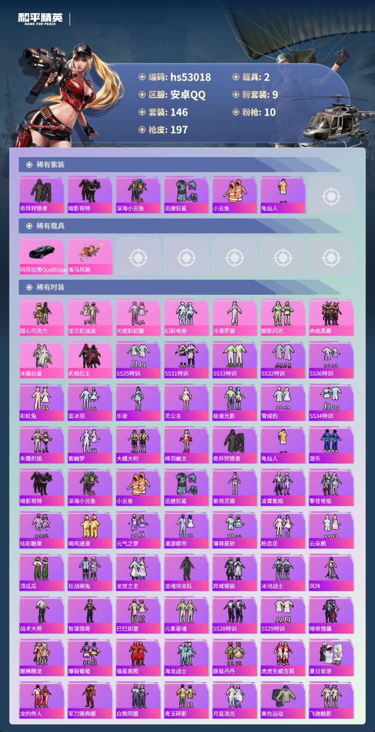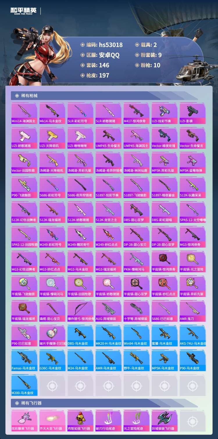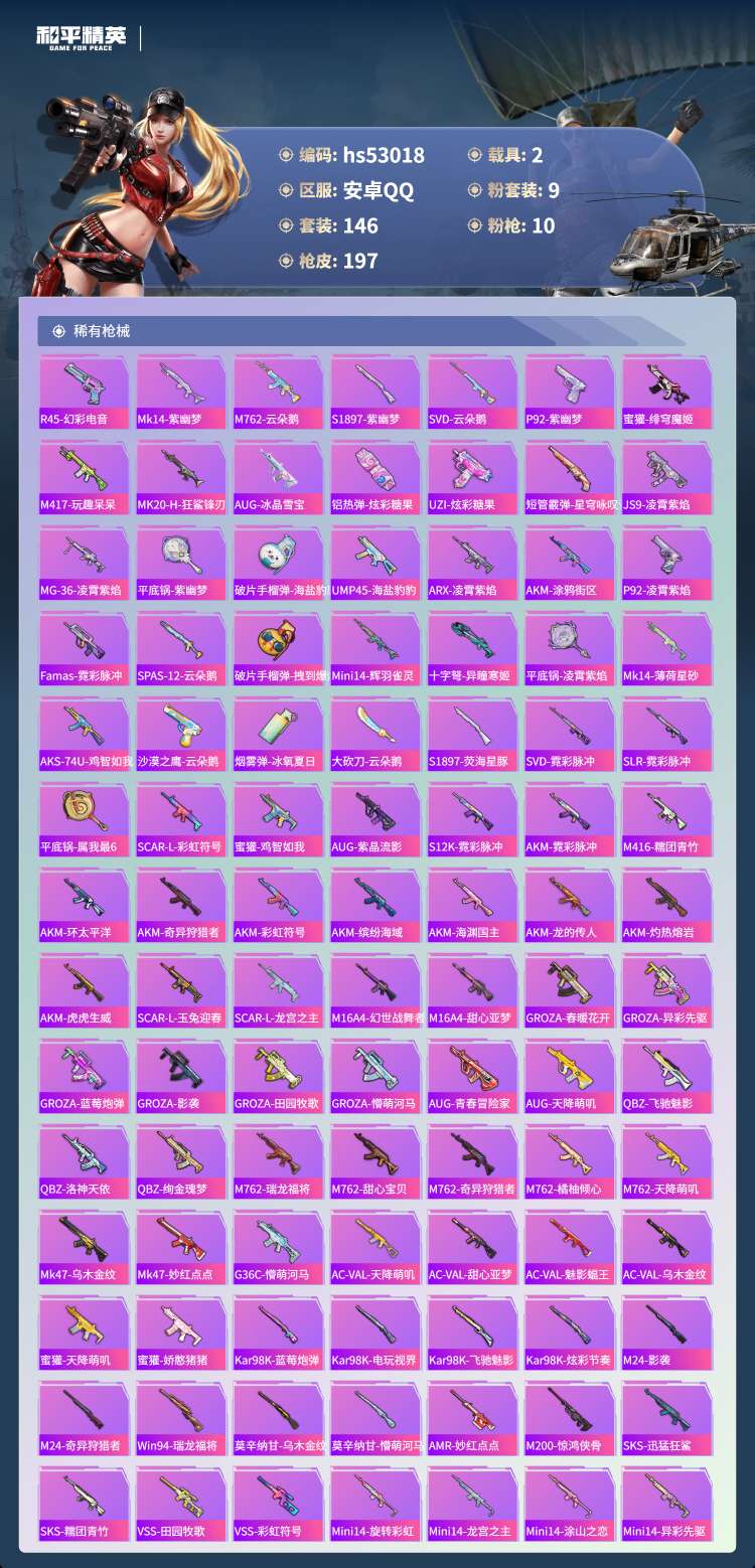 hs53018 安卓手Q-14王牌印记-9粉装-10特效枪-2载具-68383热力值-146套装-1