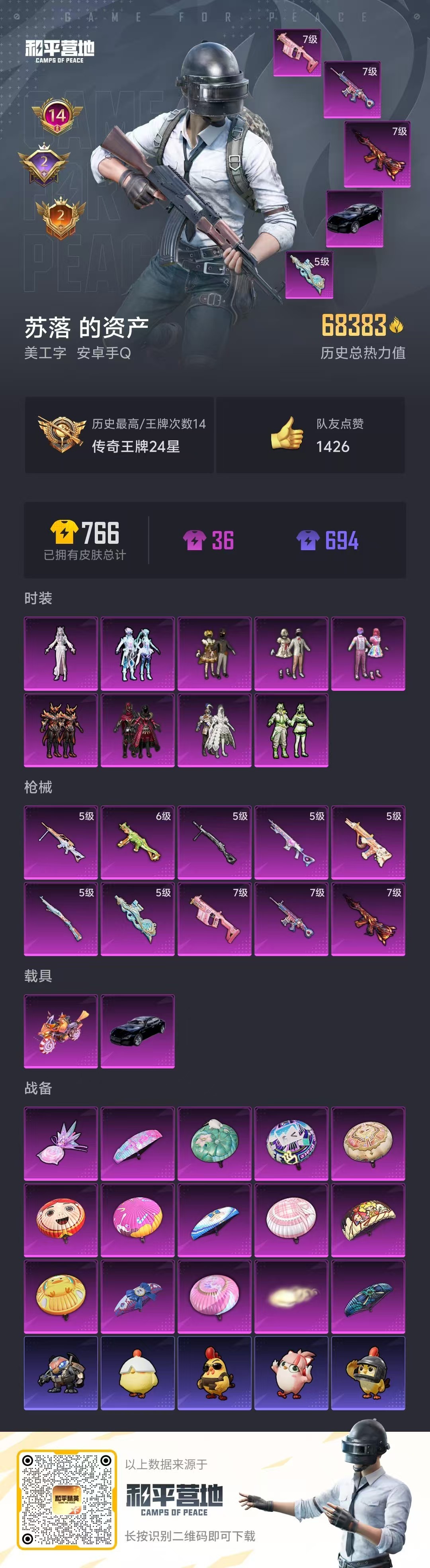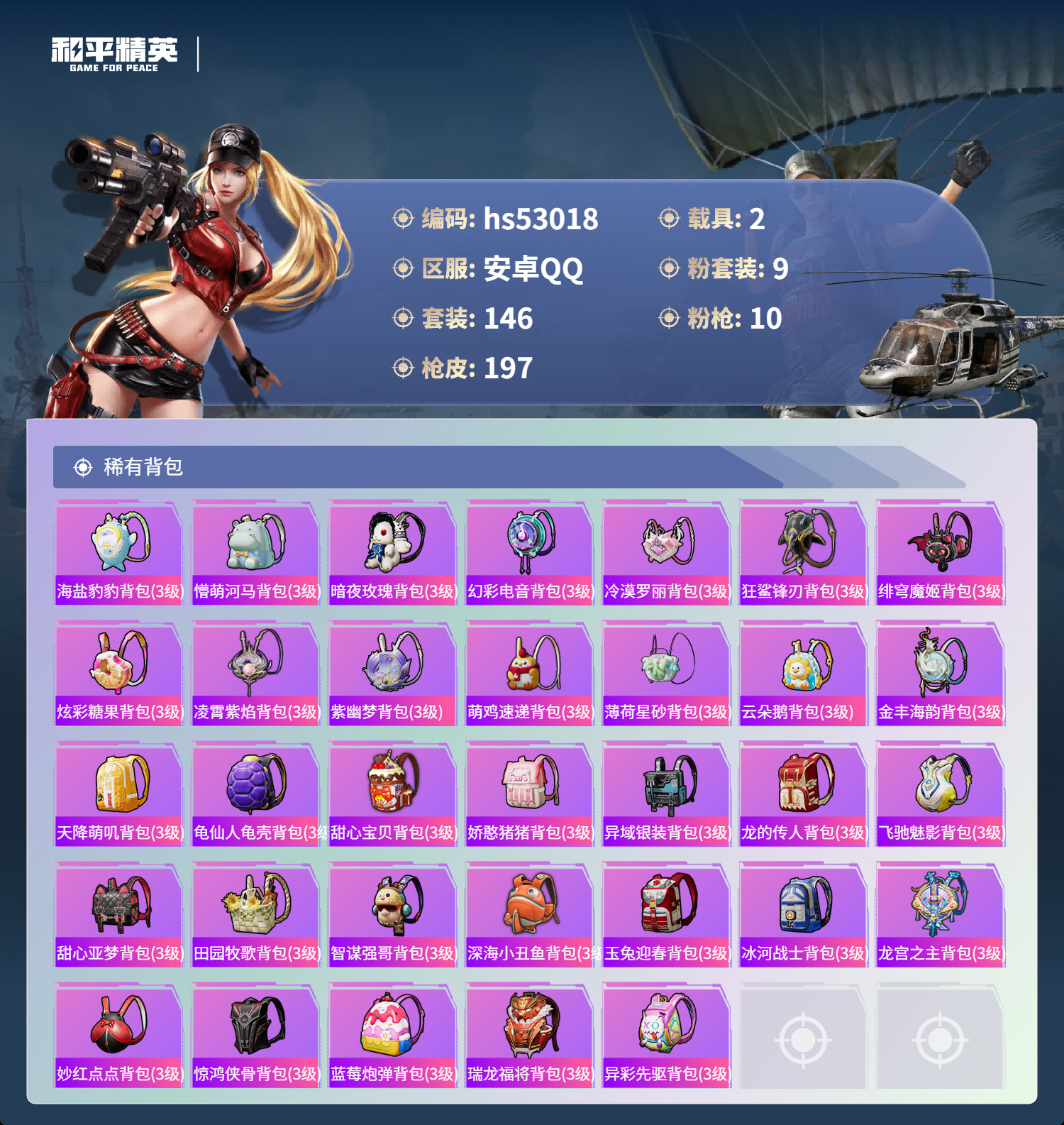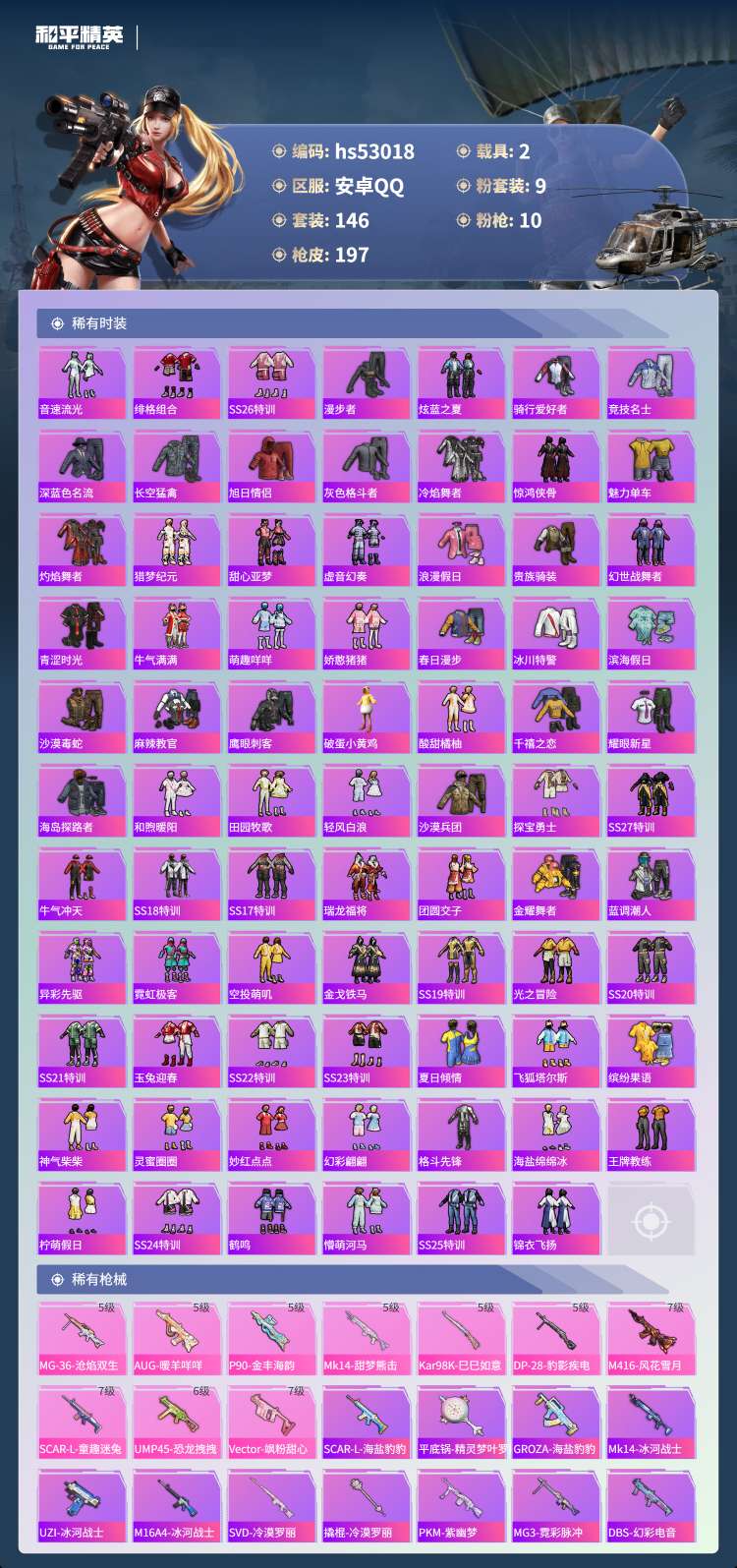 hs53018 安卓手Q-14王牌印记-9粉装-10特效枪-2载具-68383热力值-146套装-1
