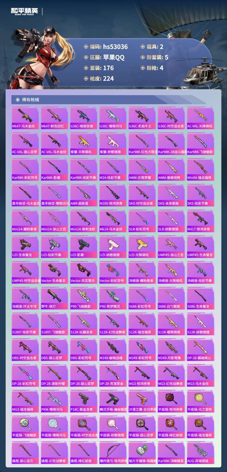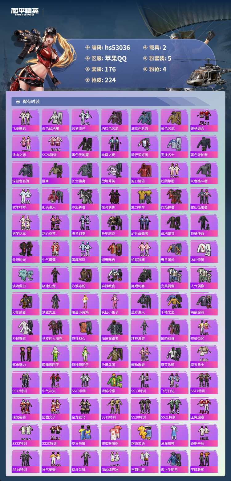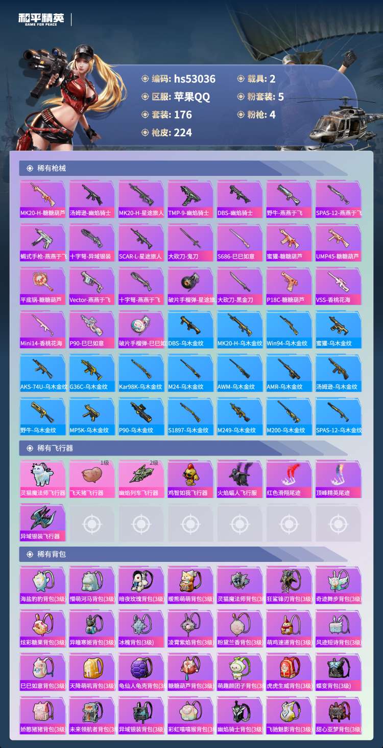 hs53036 苹果手Q-15王牌印记-5粉装-4特效枪-2载具-68304热力值-176套装-22