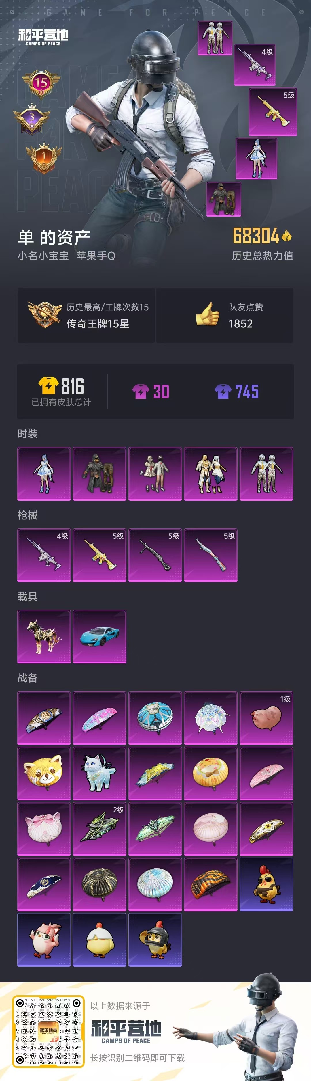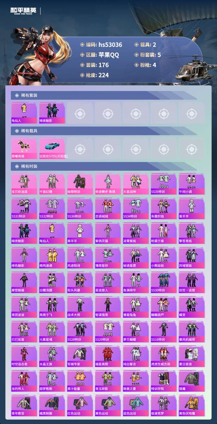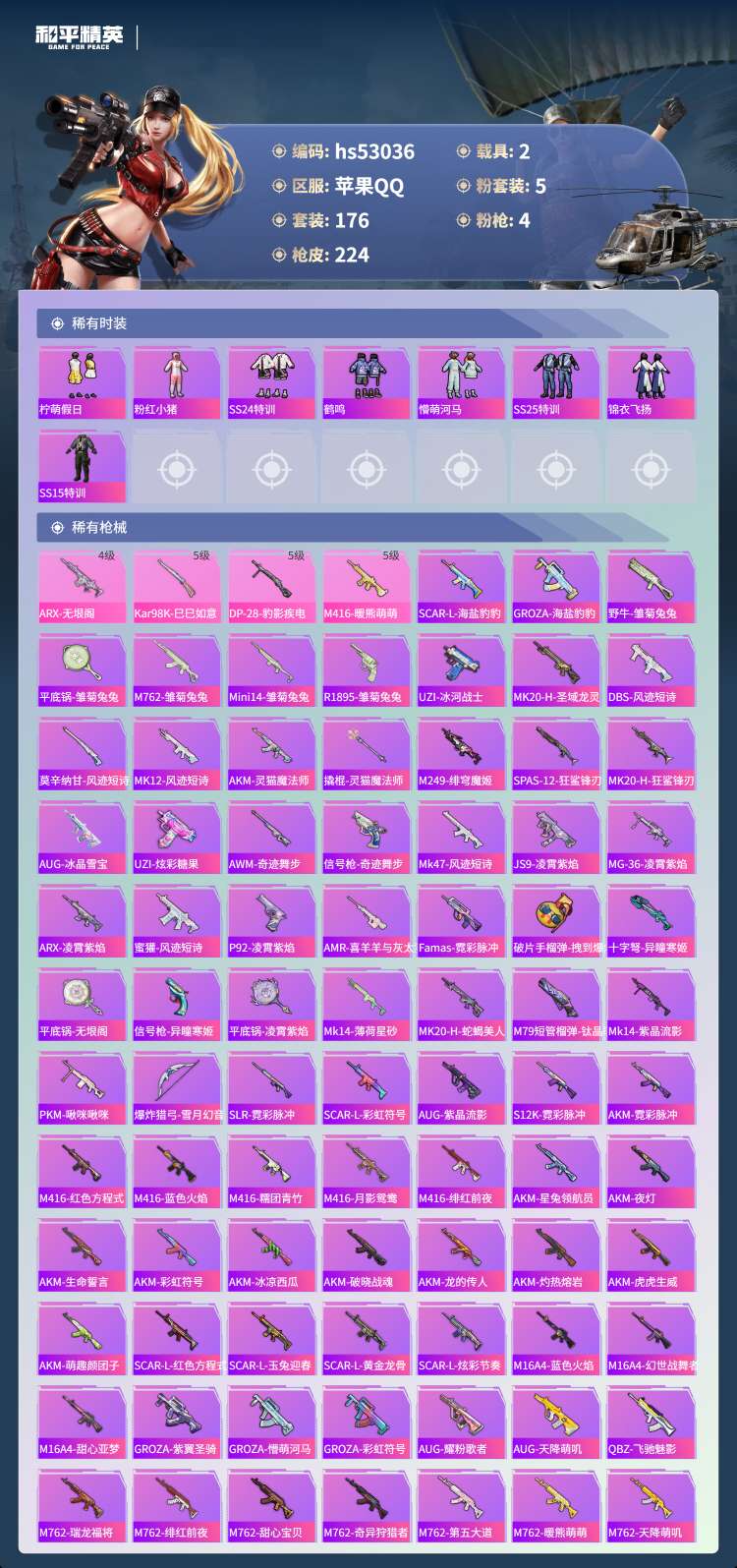 hs53036 苹果手Q-15王牌印记-5粉装-4特效枪-2载具-68304热力值-176套装-22
